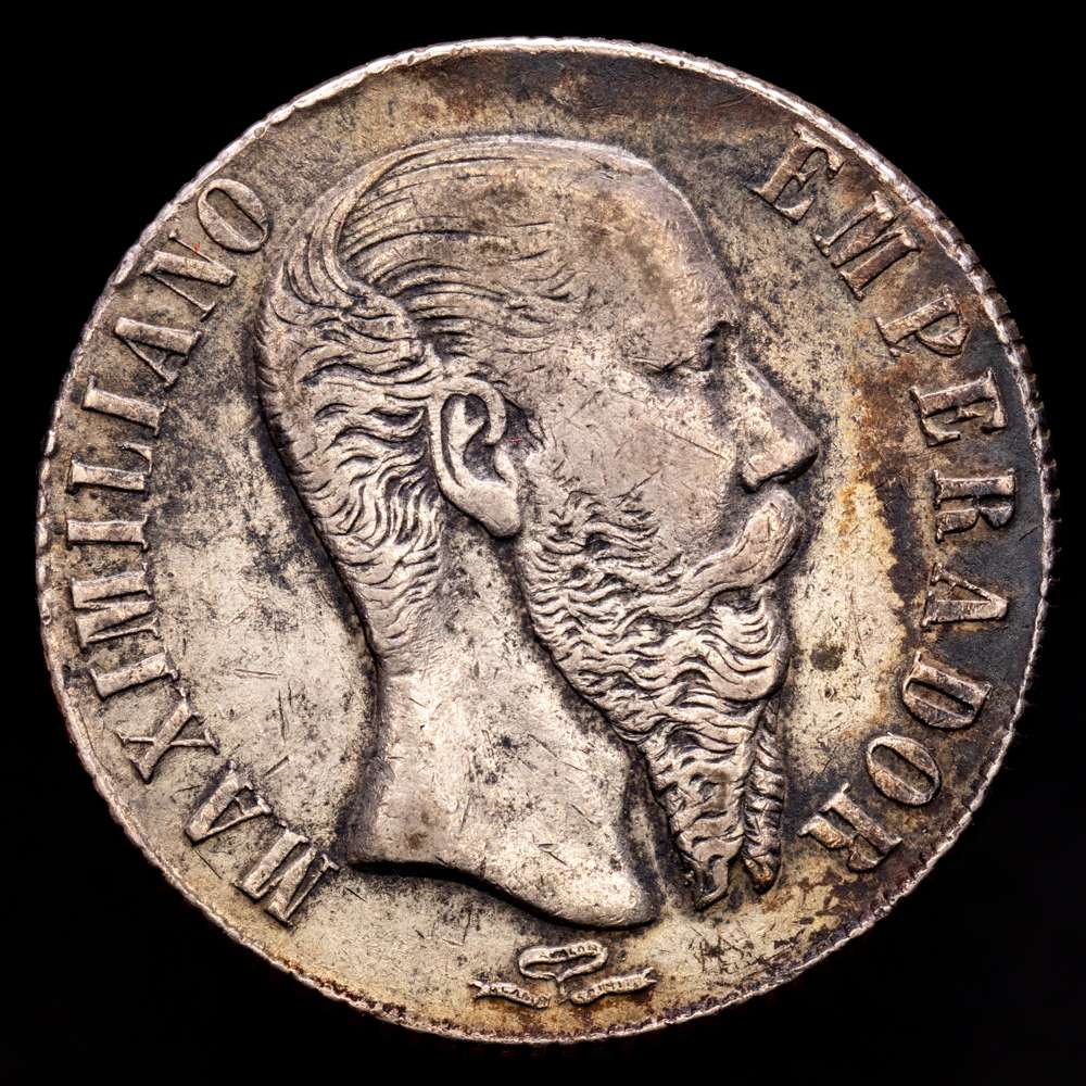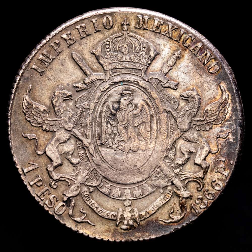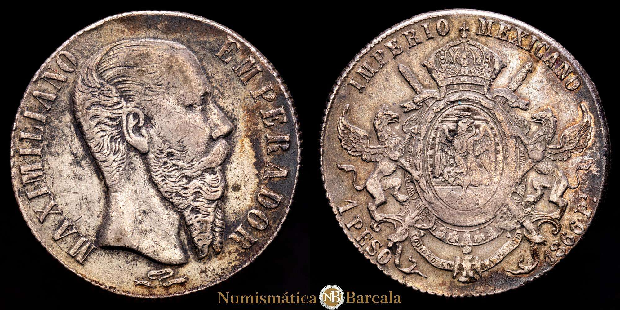 Numismática Barcala > Productos > 1 peso. 1866-Pi. MAXIMILIANO EMPERADOR. San Luis de Potosí. (Km-388.2). Ag. 27,01 g. Pátina. Muy escasa. MBC+.