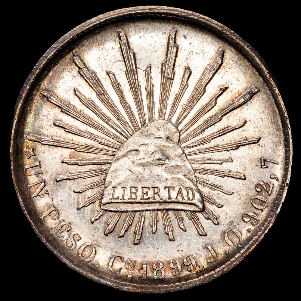 1 Peso. 1899-Cn. CULIACÁN. JQ. 27,16 gramos. Gran parte de brillo. KM-409. UNC-. Buena acuñación, relieves sin ningún tipo de debilidad o desvanecimiento en puntos altos por contacto, la pieza muestra un abundante brillo por ambos lados, aunque el reverso posee una mallor parte de pátina iridiscente, minimas marquitas.