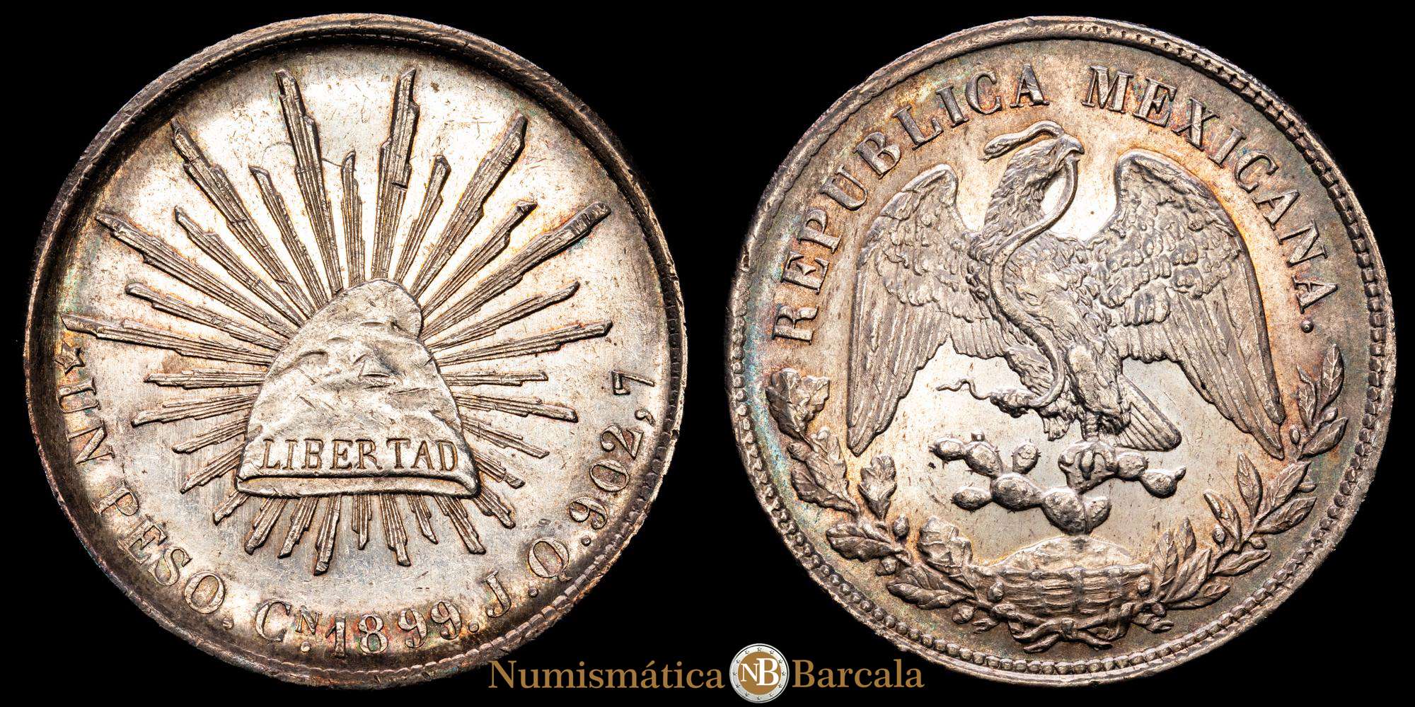 Numismática Barcala > Productos > 1 Peso. 1899-Cn. CULIACÁN. JQ. 27,16 gramos. Gran parte de brillo. KM-409. UNC-. Buena acuñación.