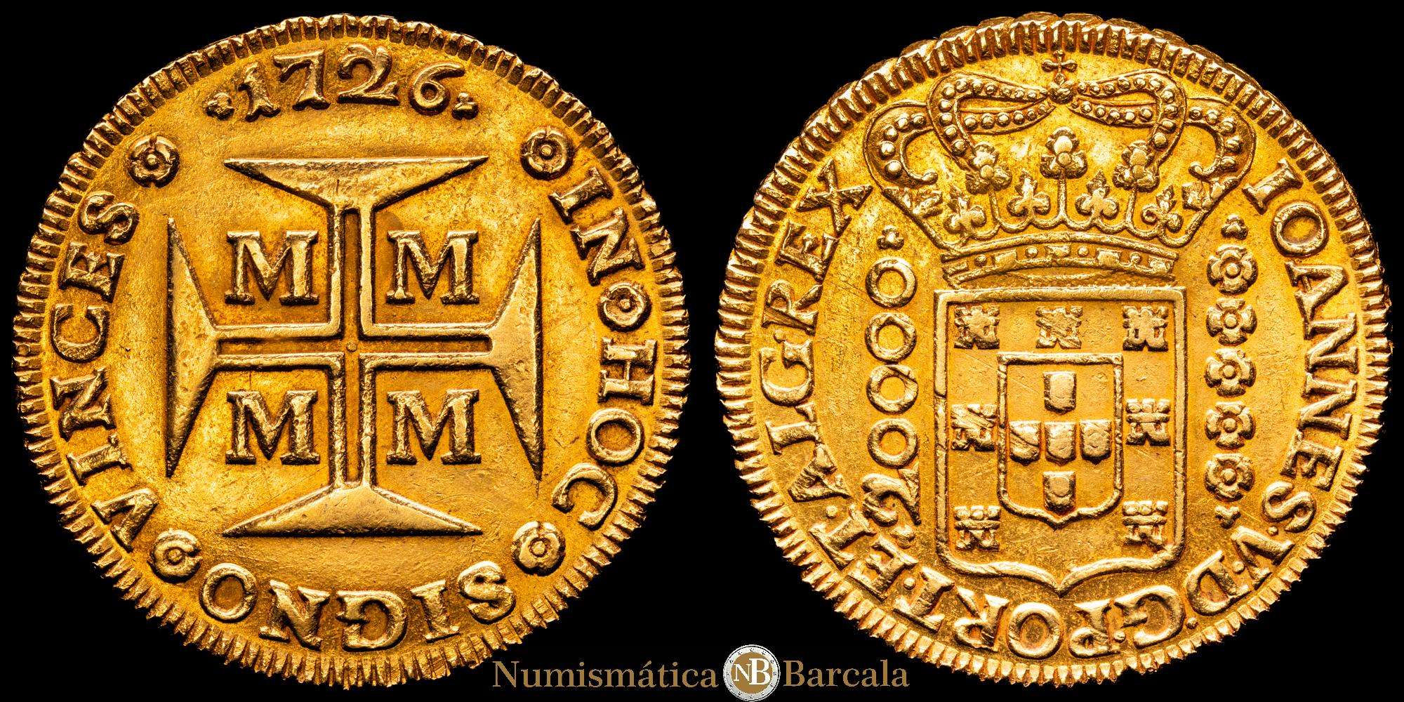 1726. Brasil. Juan V. M (Minas Gerais). 20.000 Reis (1 dobrao). (Fr. 33) (Gomes 106.03). 53,73 gramos. AU. Muy bella. Rara. EBC.