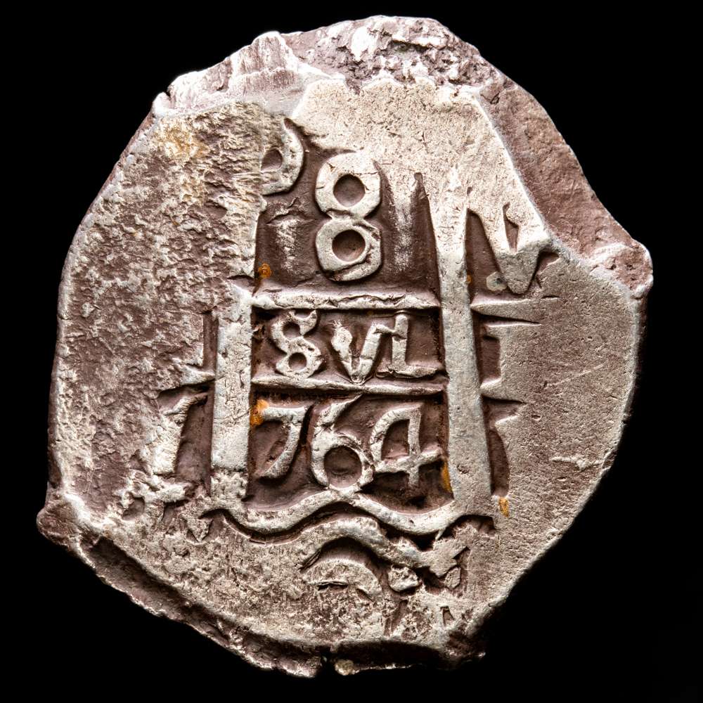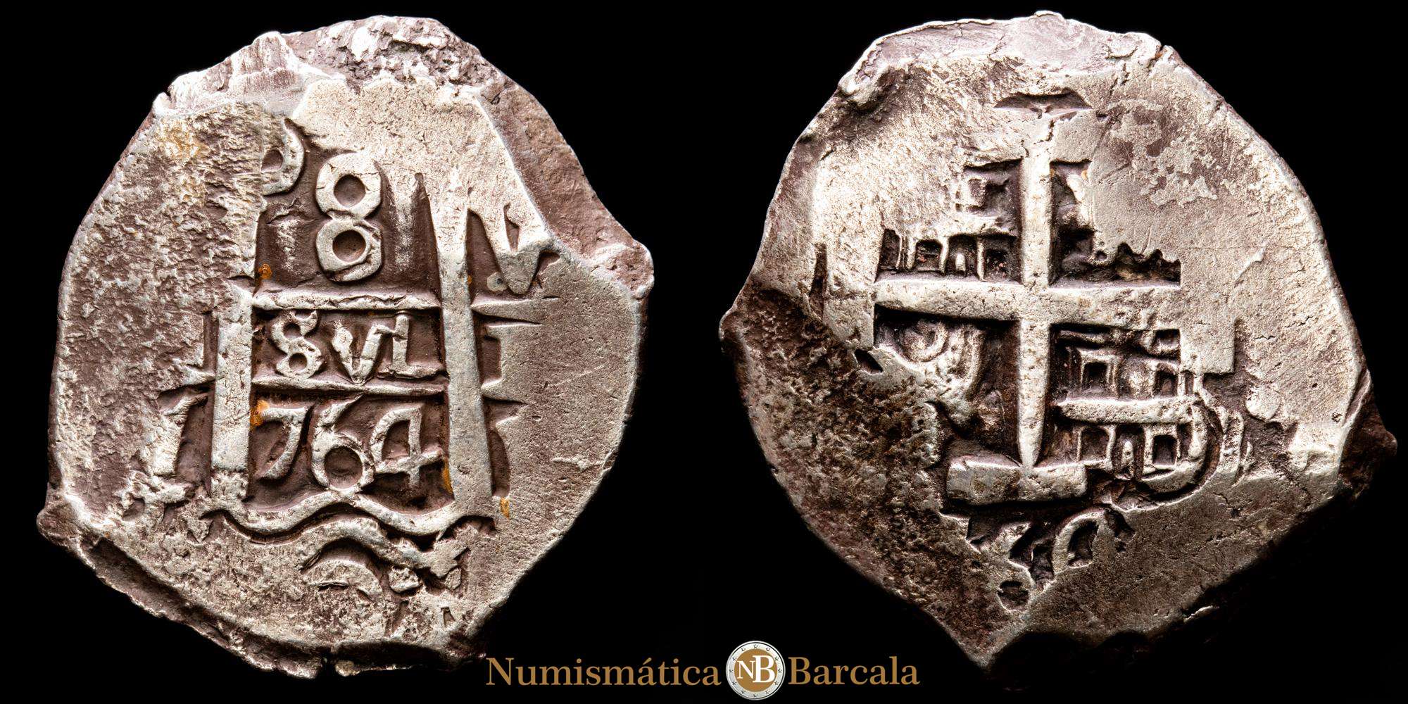 1764. Carlos III. Potosí. VY. 8 reales. (26,92 g.). (AC. 1140) (Paoletti, 435). Doble fecha, una parcial. Ensayador V en anverso, Y en el inferior izquierdo. Buen ejemplar. MBC+.