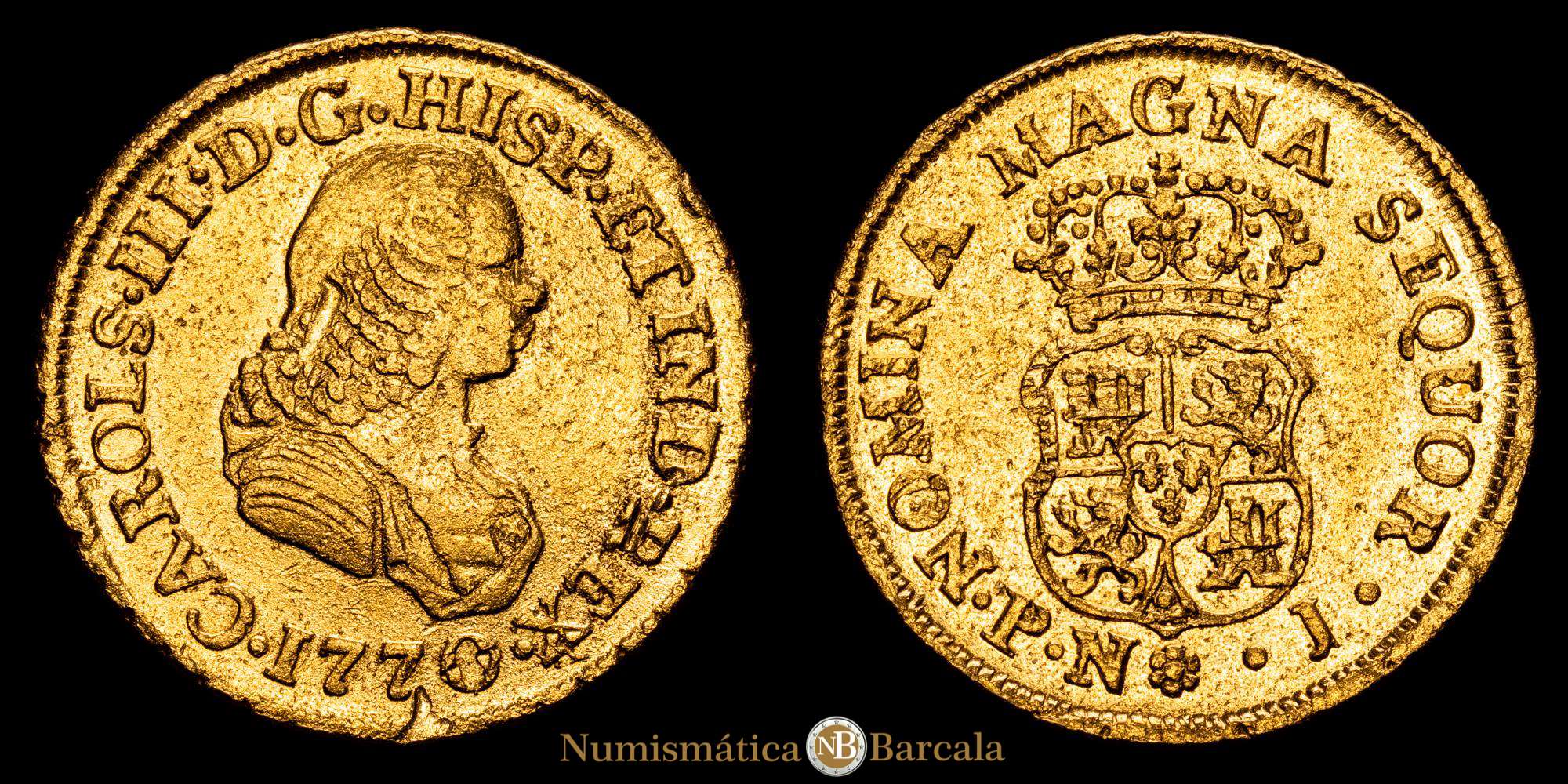 Numismática Barcala > Productos > 1770. Carlos III. Popayán. J. 2 escudos. (AC. 1624) (Restrepo 58-16). Busto de Fernando VI. Bonito color. Escasa. (6,68 g.). (EBC-) .Oxidaciones marinas. Rara ..