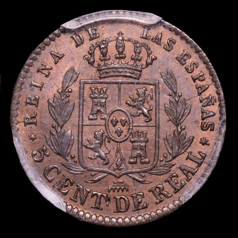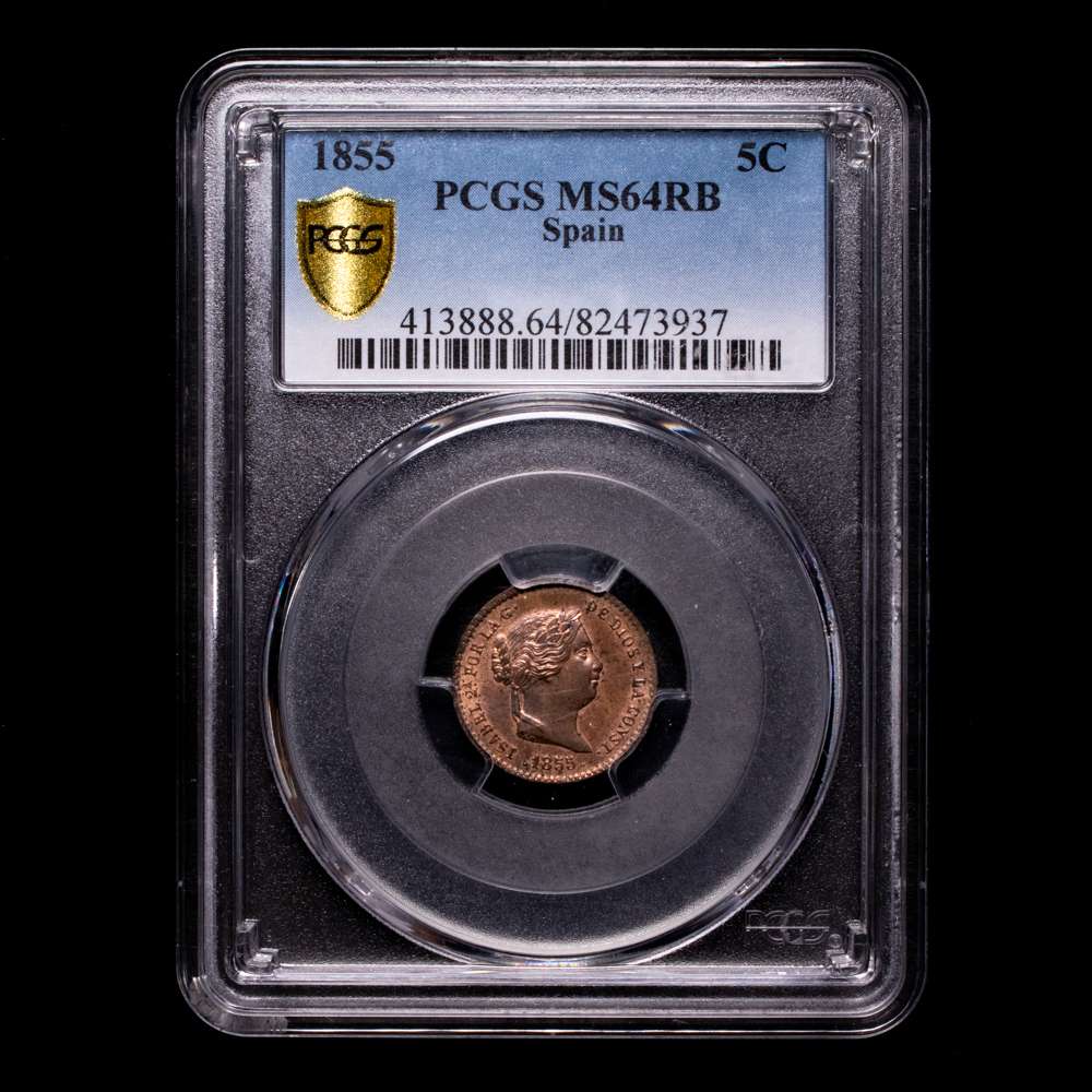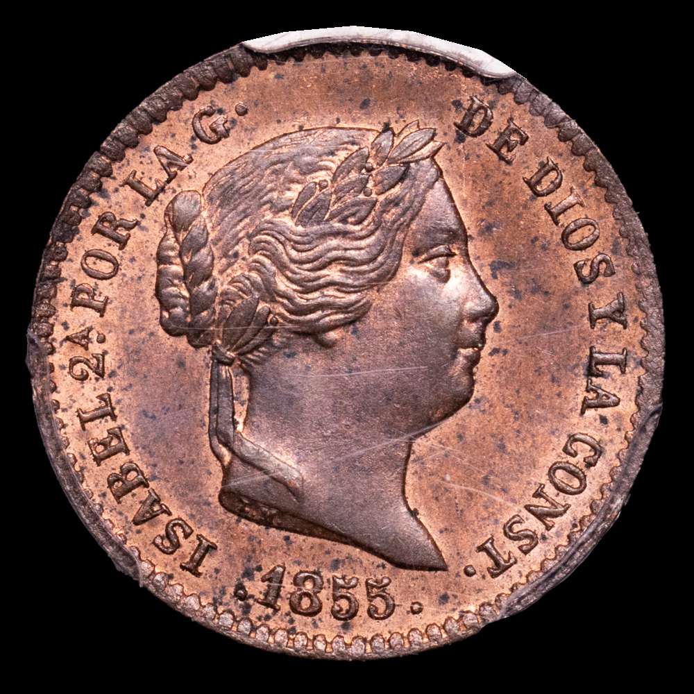Numismática Barcala > Productos > 1855. Isabel II. Segovia. 5 céntimos de real. (AC. 160). Bella. Brillo original. En cápsula de la PCGS como MS64 RB. Escasa así. S/C.