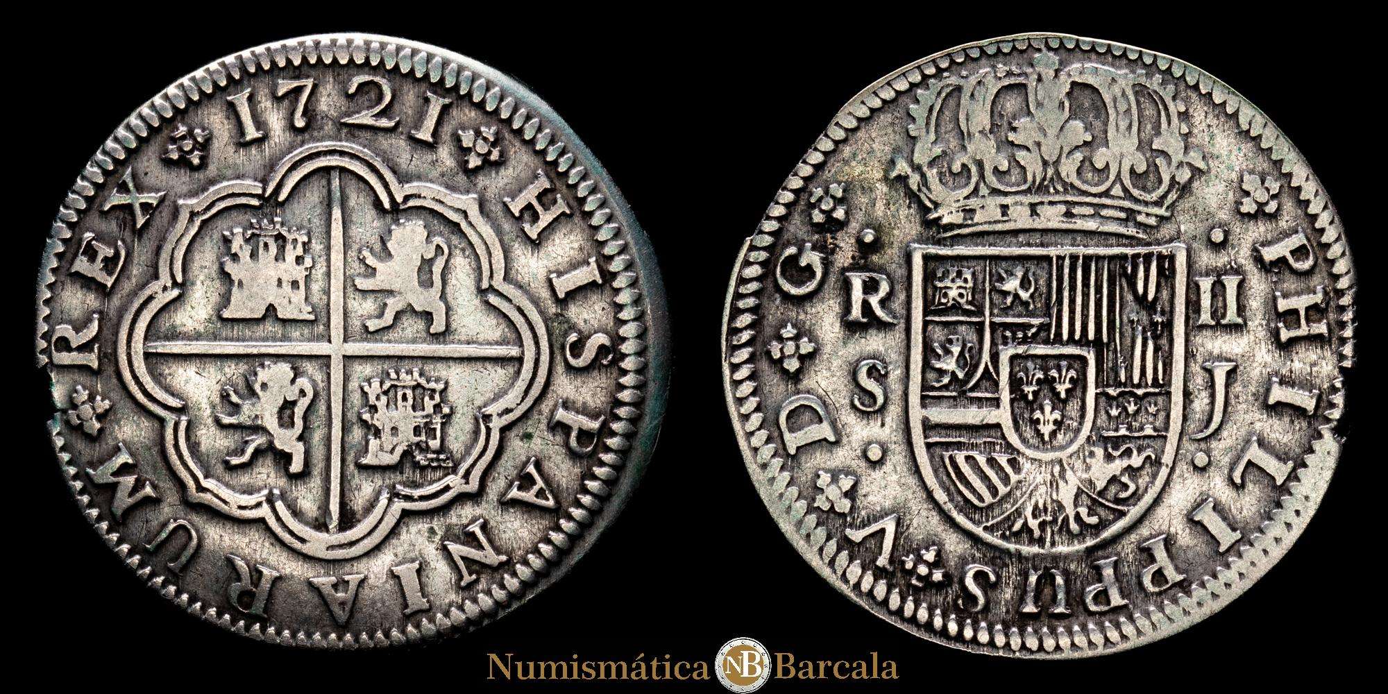 2 Reales. 1721. Sevilla J. plata 833, 5,40g. FELIPE V. Cal-2019-979. MBC.