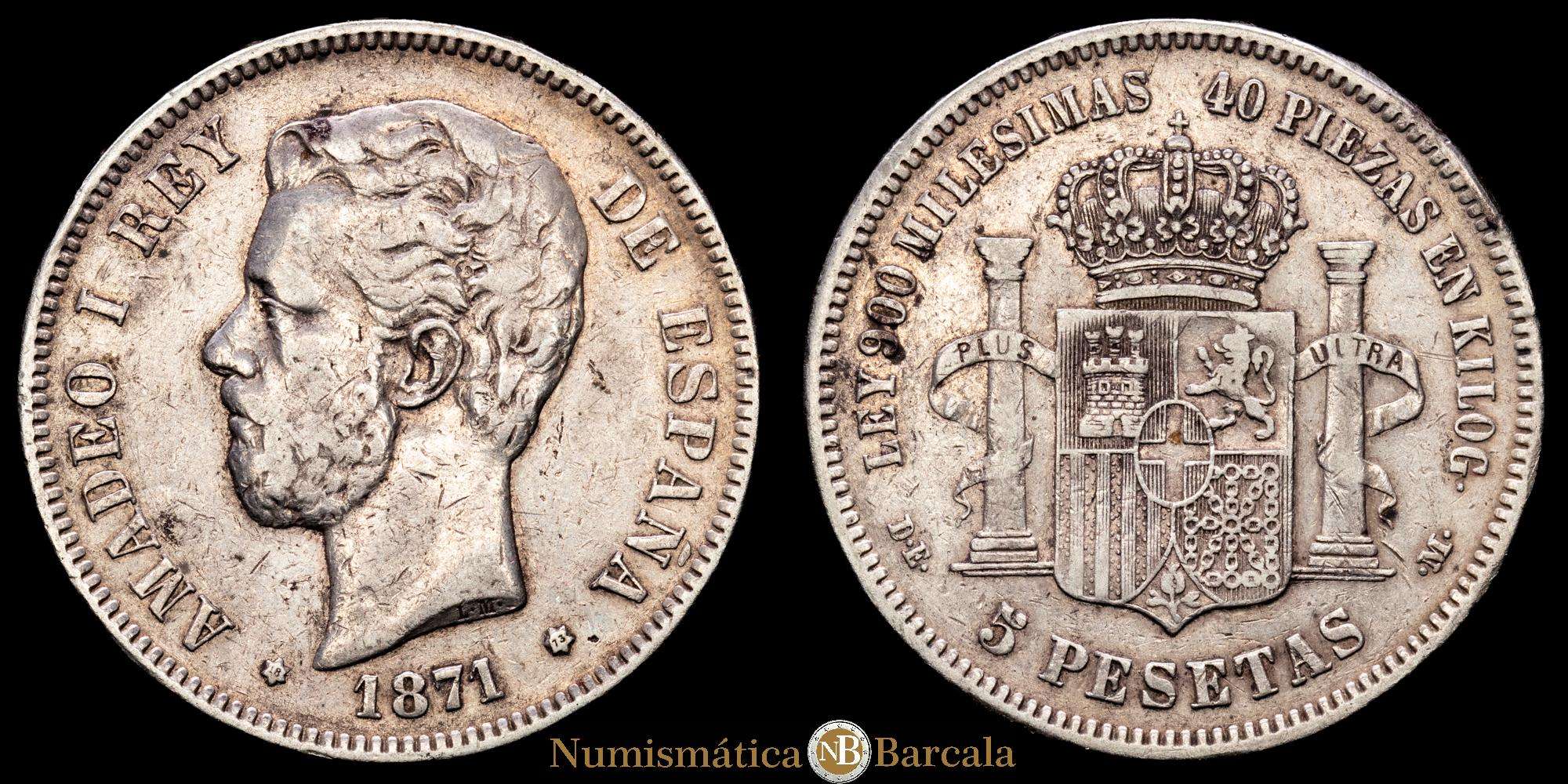5 pesetas. 1871*18-73. Madrid DE-M. AMADEO I.Cal-2019-3. 24,81 g. plata 900. MBC-. Escasa.