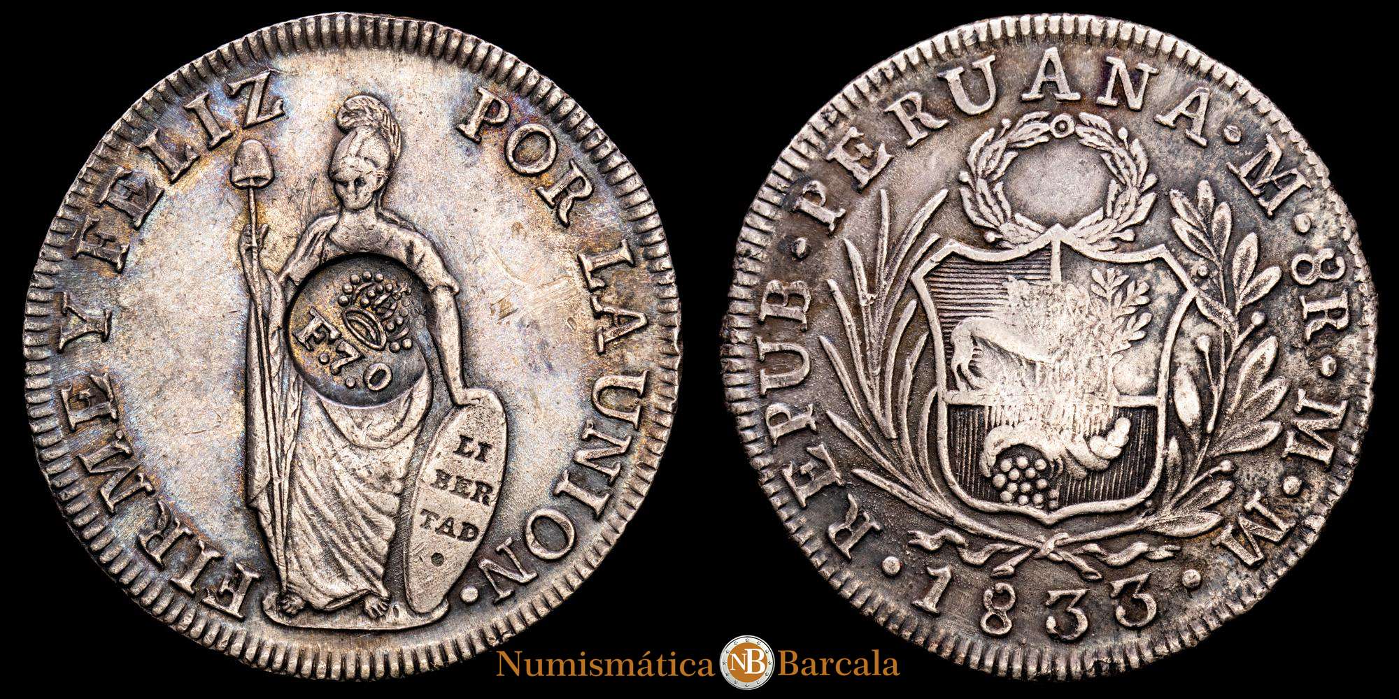 8 Reales. (1832-1834). MANILA. 26,37grs. Resello F.7º superado de corona sobre 8 Reales PERÚ 1833 Lima-MM KM-83 de Filipinas. MBC+. Tono.