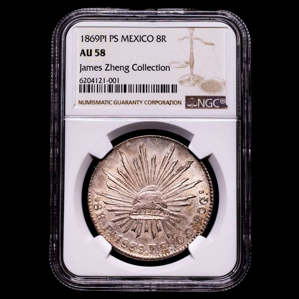 8 Reales de la República de México , 1869 Pi-PS. Encapsulado por NGC como AU58, ceca de San Luis Potosí, KM377.12, DP-Pi57.
