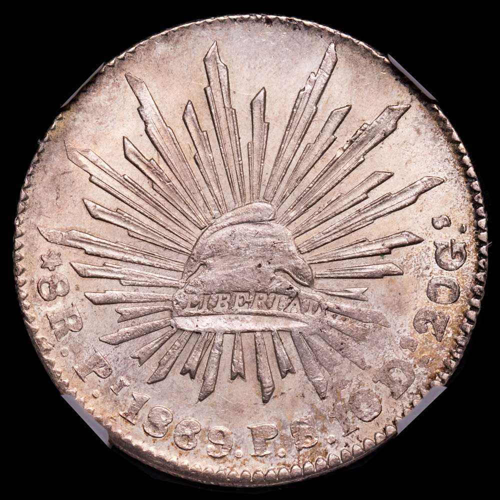 , 1869 Pi-PS. Encapsulado por NGC como AU58, ceca de San Luis Potosí, KM377.12, DP-Pi57.