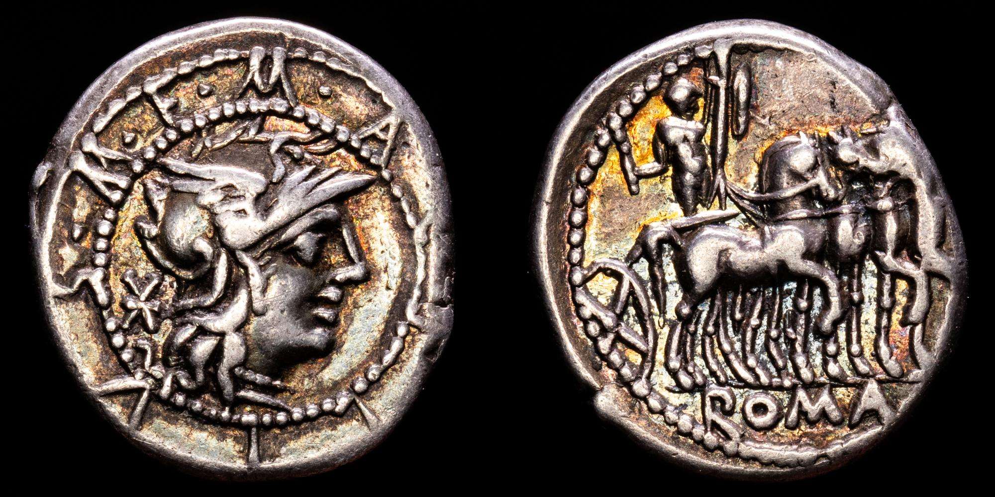 Numismática Barcala > Productos > Acilia. Marco Acilio Marci f. Denario. 130 d. C. Roma. (Ffc-93). (Craw-255/1). (Cal-65). Ag. 3,90 gramos. Bonita pátina de monetario con tonos iridiscentes. MBC+.