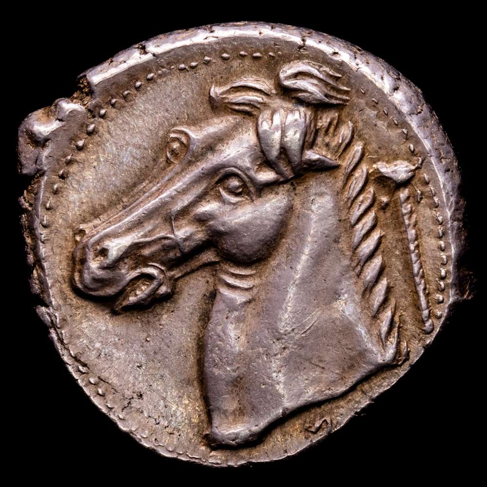 Numismática Barcala > Productos > Acuñaciones Cartaginesas en Sicilia. Entel. Tetradracma. 400-360 aC (Hgc-284). Ag. 17,26 gramos. Excelente Estilo. Bellísimo ejemplar. XF/XF+.