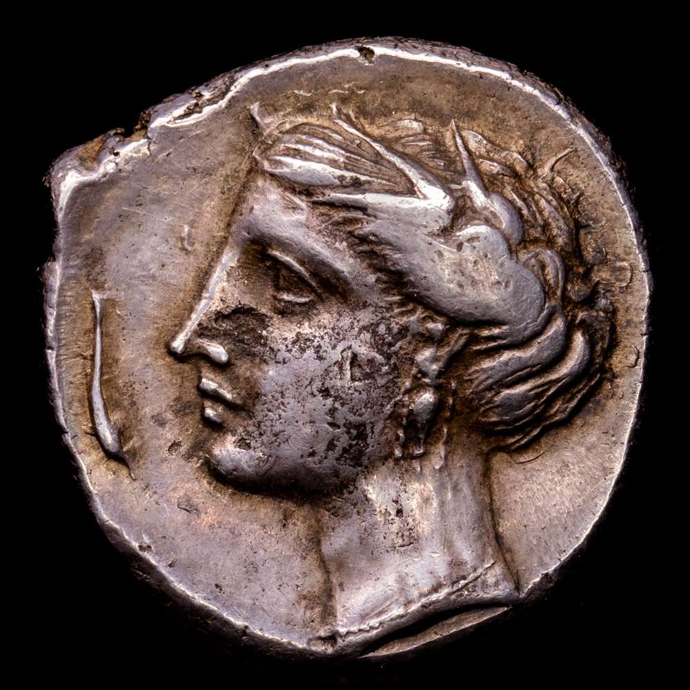 Numismática Barcala > Productos > Acuñaciones Cartaginesas en Sicilia. Entel. Tetradracma. 400-360 aC (Hgc-284). Ag. 17,26 gramos. Excelente Estilo. Bellísimo ejemplar. XF/XF+.