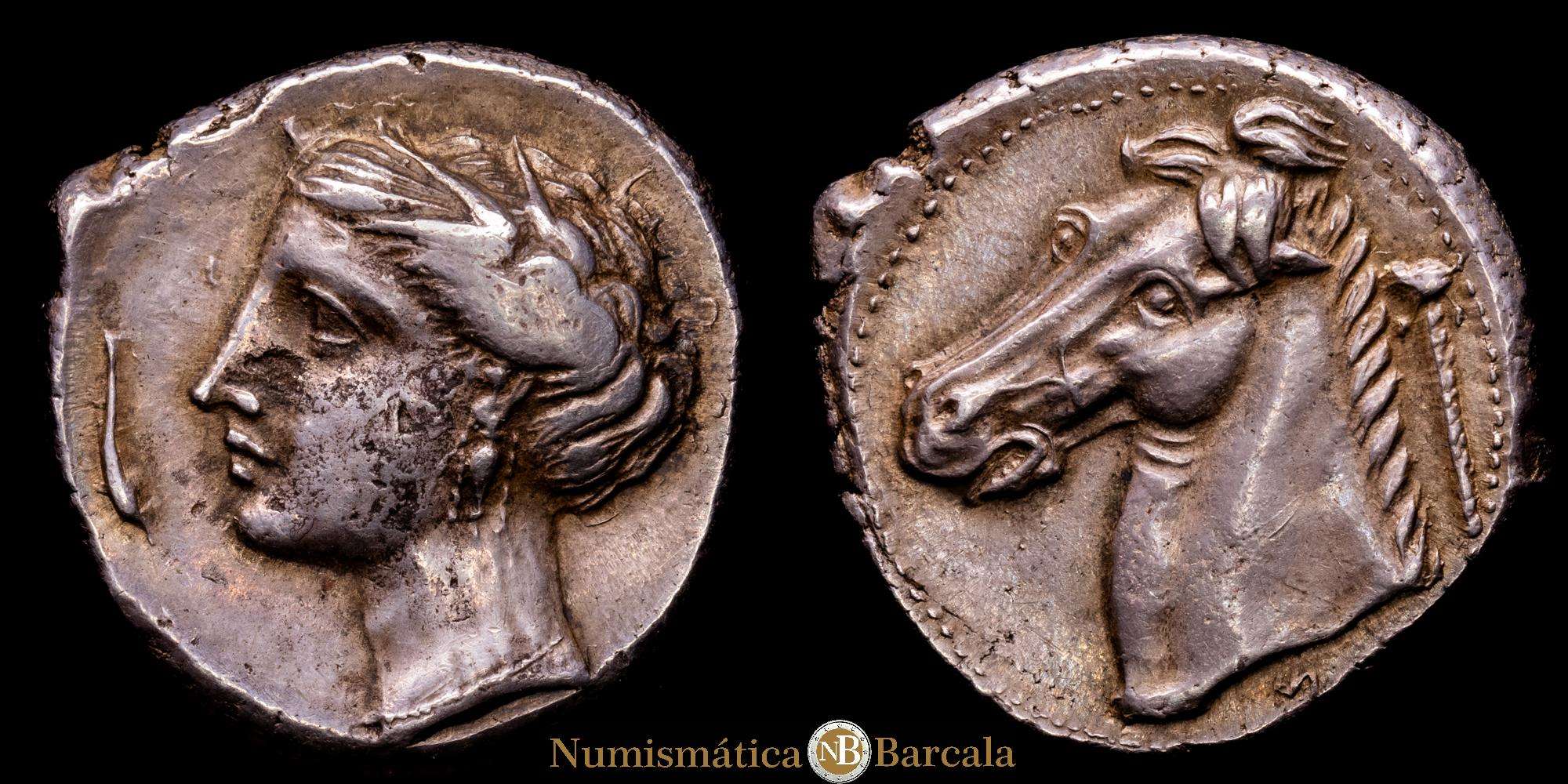 Acuñaciones Cartaginesas en Sicilia. Entel. Tetradracma. 400-360 aC (Hgc-284). Anv.: Cabeza de Tanit-Perséfone a izquierda peinada con espigas y rodeada de delfines. Rev.: Prótomo de caballo a izquierda, detrás de palmera con frutos, debajo de leyenda púnica M (Mem). Ag. 17,26 gramos. Excelente Estilo. Bellísimo ejemplar. XF/XF+.