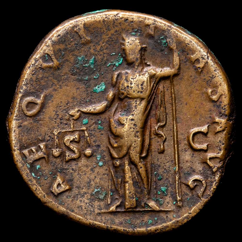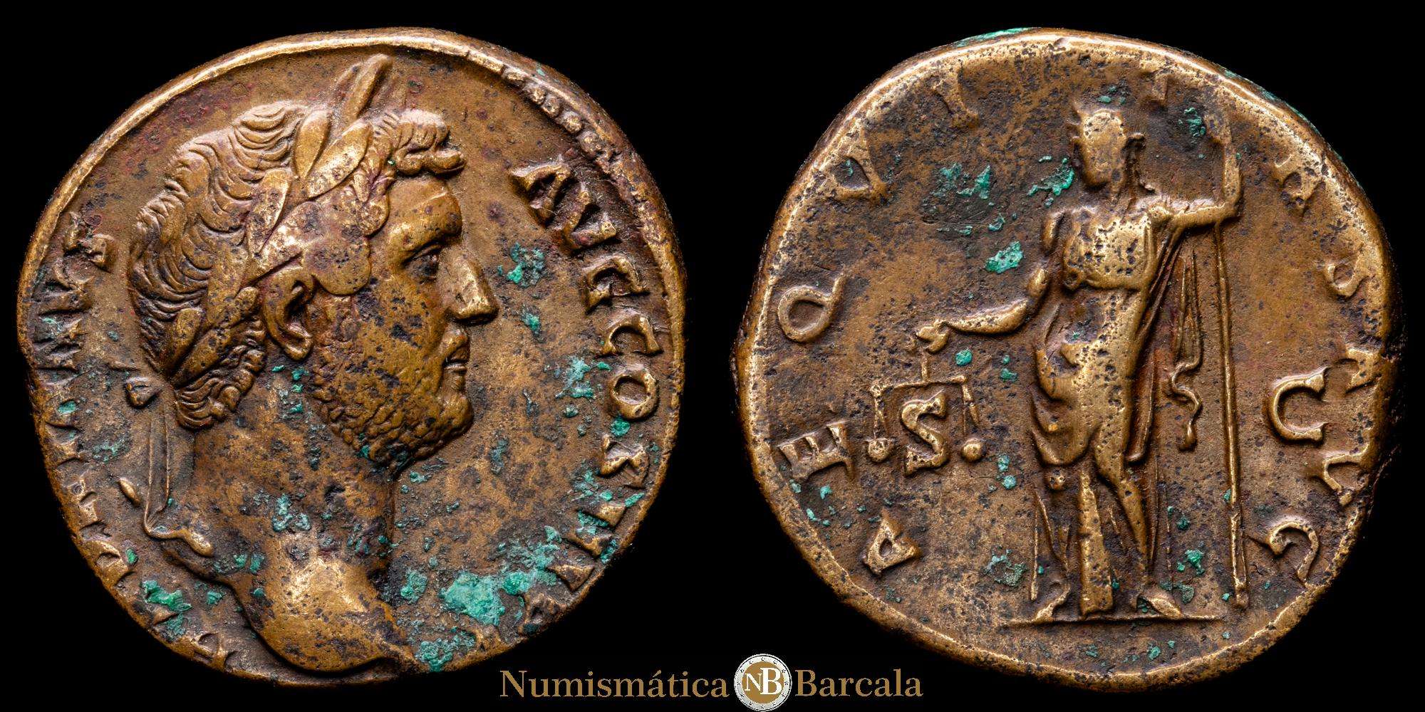 ADRIANO (117-138). Sestercio. Roma (137-138). A/ Cabeza laureada a der.; HADRIANVS AVG COS III P P. R/ Aequitas a izq. con balanza y cetro; AEQVITAS AVG S-C. AE 29,05 g. RIC-2370. VF+.