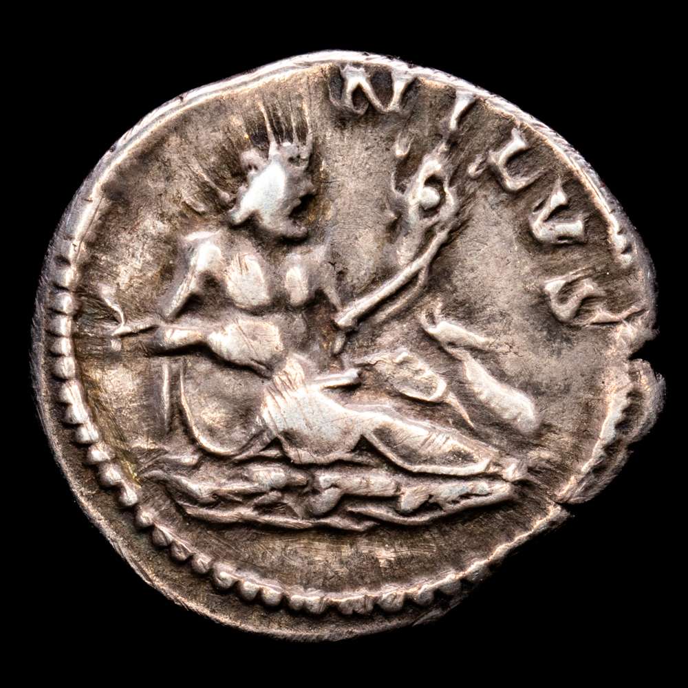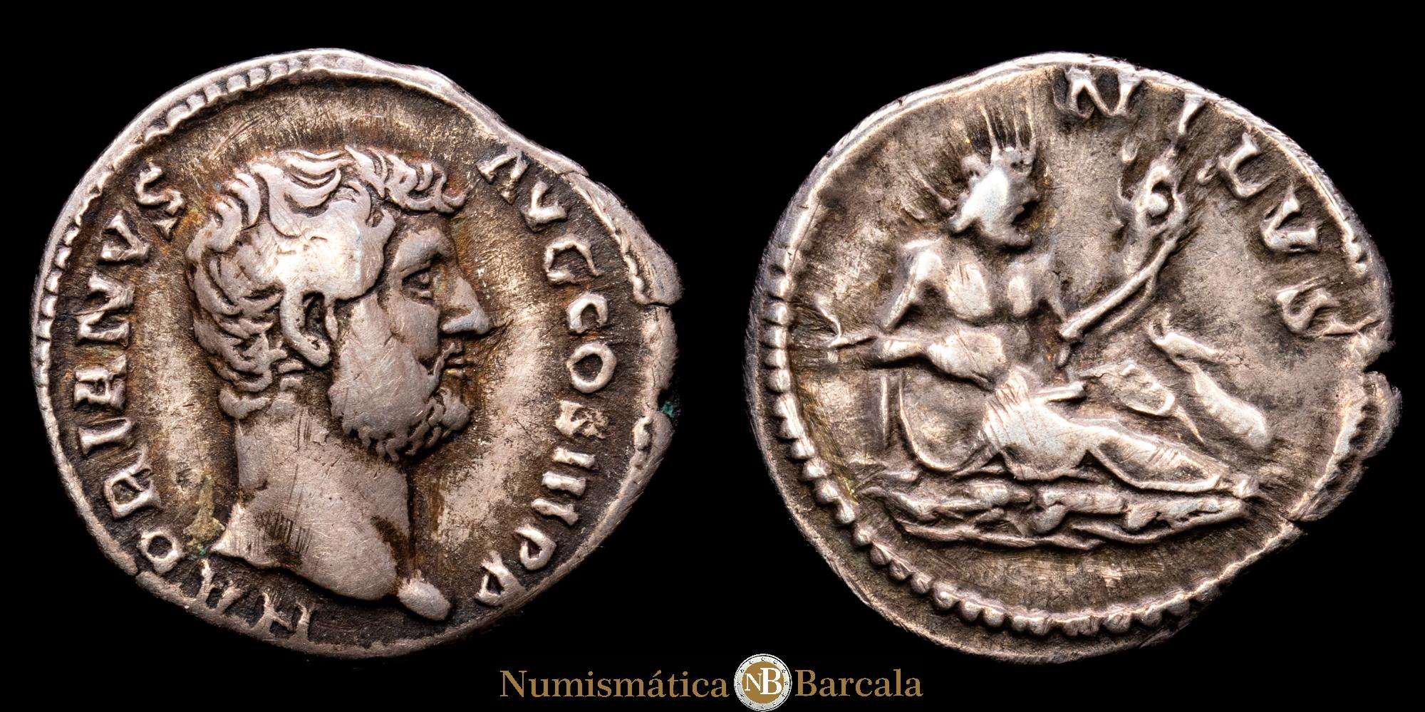 , 117-138 d. C. Denario (plata, 19 mm, 2,71 g, 12 h), Roma, ca. 130-133 d. C. HADRIANVS AVG COS III PP. Efigie laureada de Adriano a la derecha. Reverso: NILVS. Nilo reclinado a la derecha sobre una urna, sosteniendo una cornucopia en la mano izquierda y una caña en la derecha; a sus pies, un hipopótamo; debajo, un cocodrilo. BMC 862. Cohen 991. RIC 1543. Acuñada con cuños ligeramente desgastados; por lo demás, en muy buen estado.