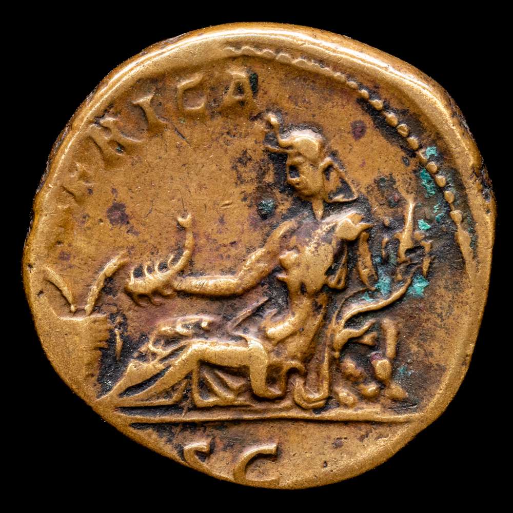 Adriano. Dupondio. 117-138 d.C. Roma. (Ric-1616). Anv.: HADRIANVS AVG COS III P P. Busto desnudo y drapeado a la derecha. Rev.: África. África reclinada a la izquierda, sosteniendo un escopión, una cornucopia y apoyando el codo sobre rocas, cesto lleno de espigas a la izquierda; SC en exergo. Ae. 13,01 g. VF.