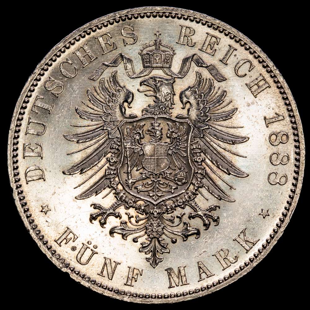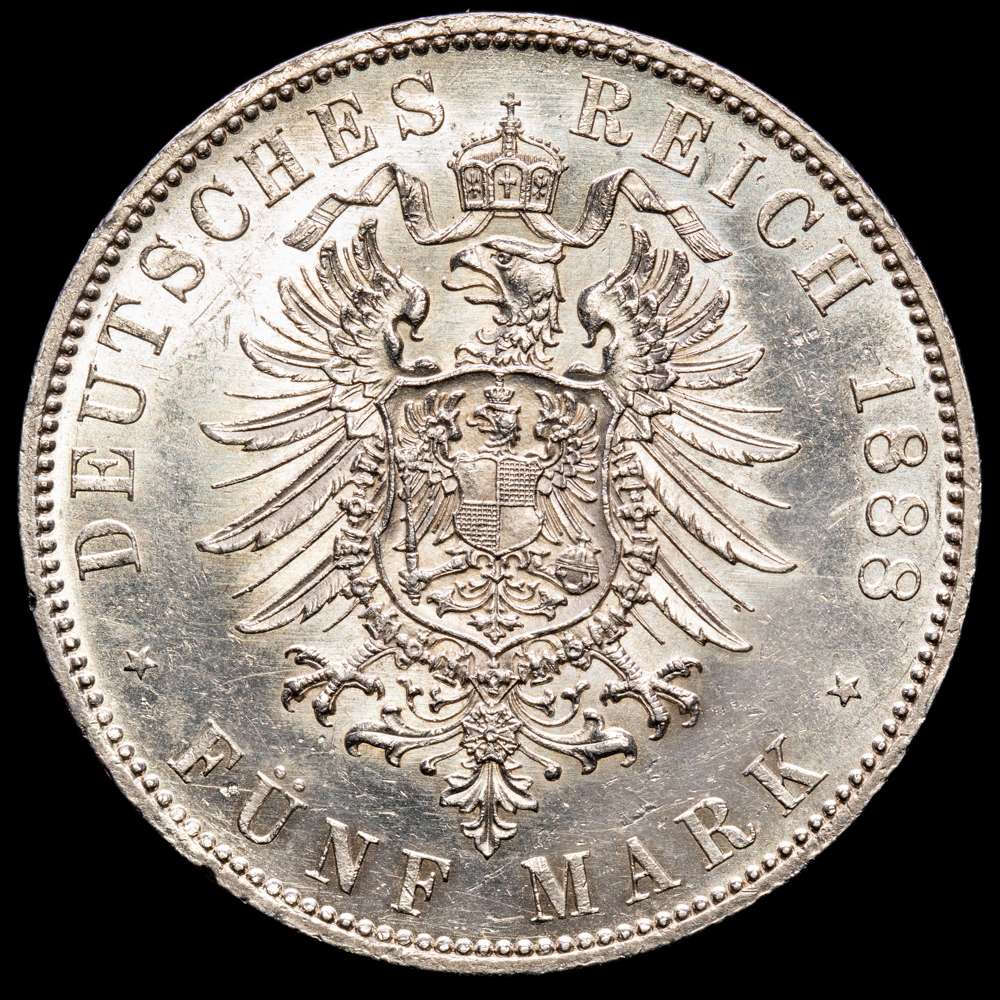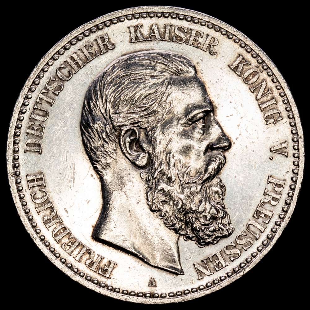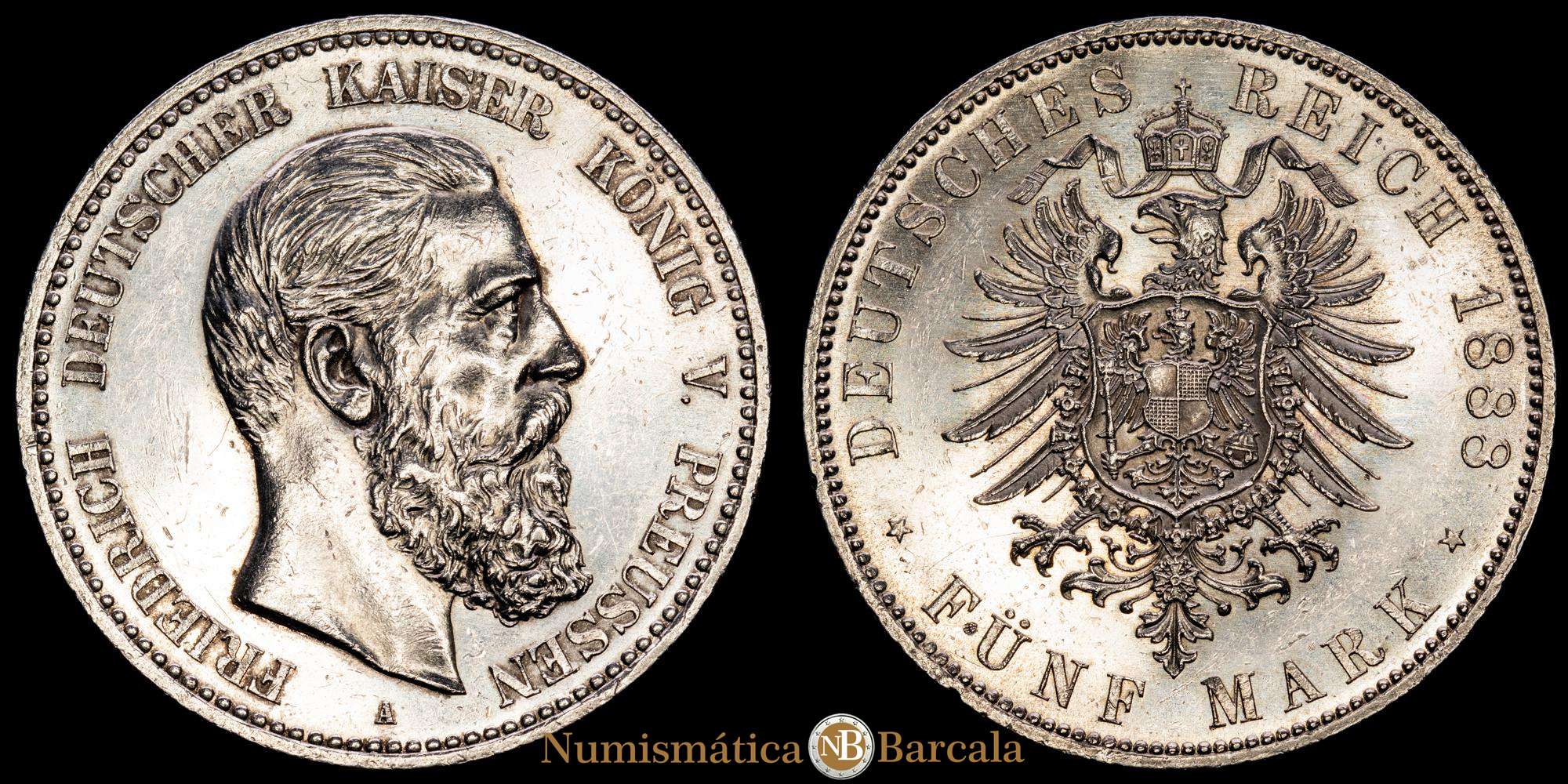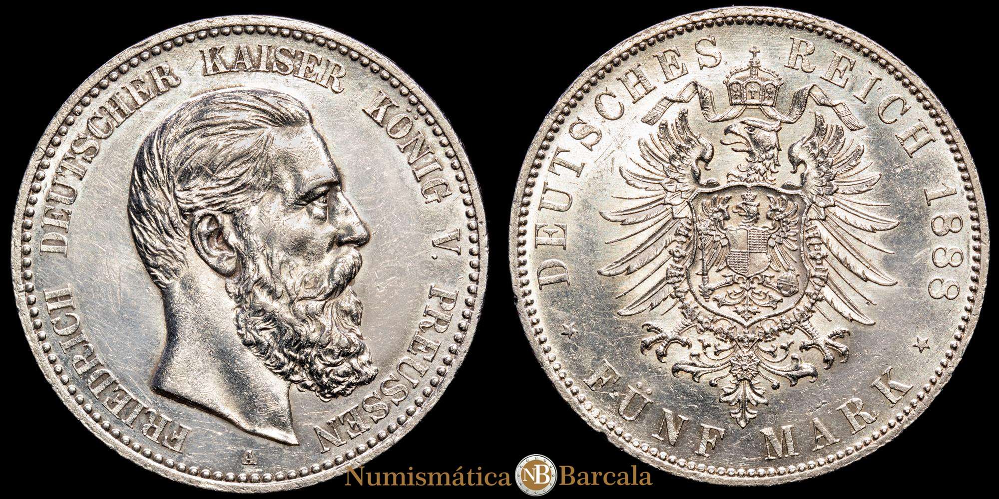 Numismática Barcala > Productos > Alemania , 5 marcos, 1888, A, Berlín. Federico III. Reino de Prusia. KM# 512. 27,83 g. UNC-.