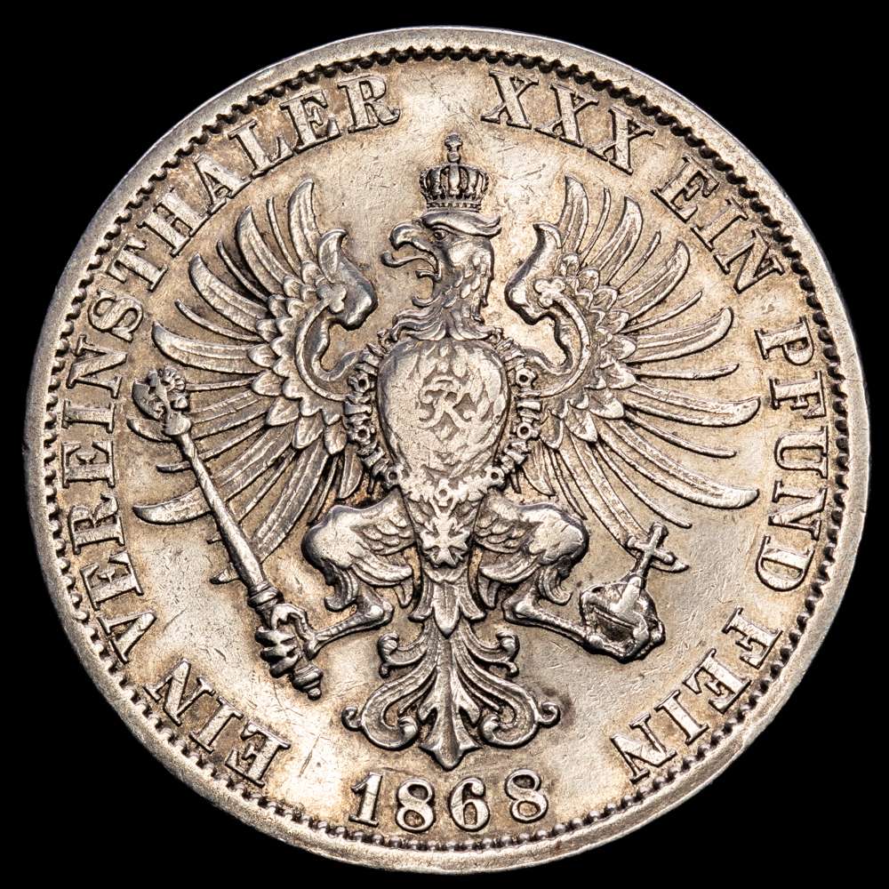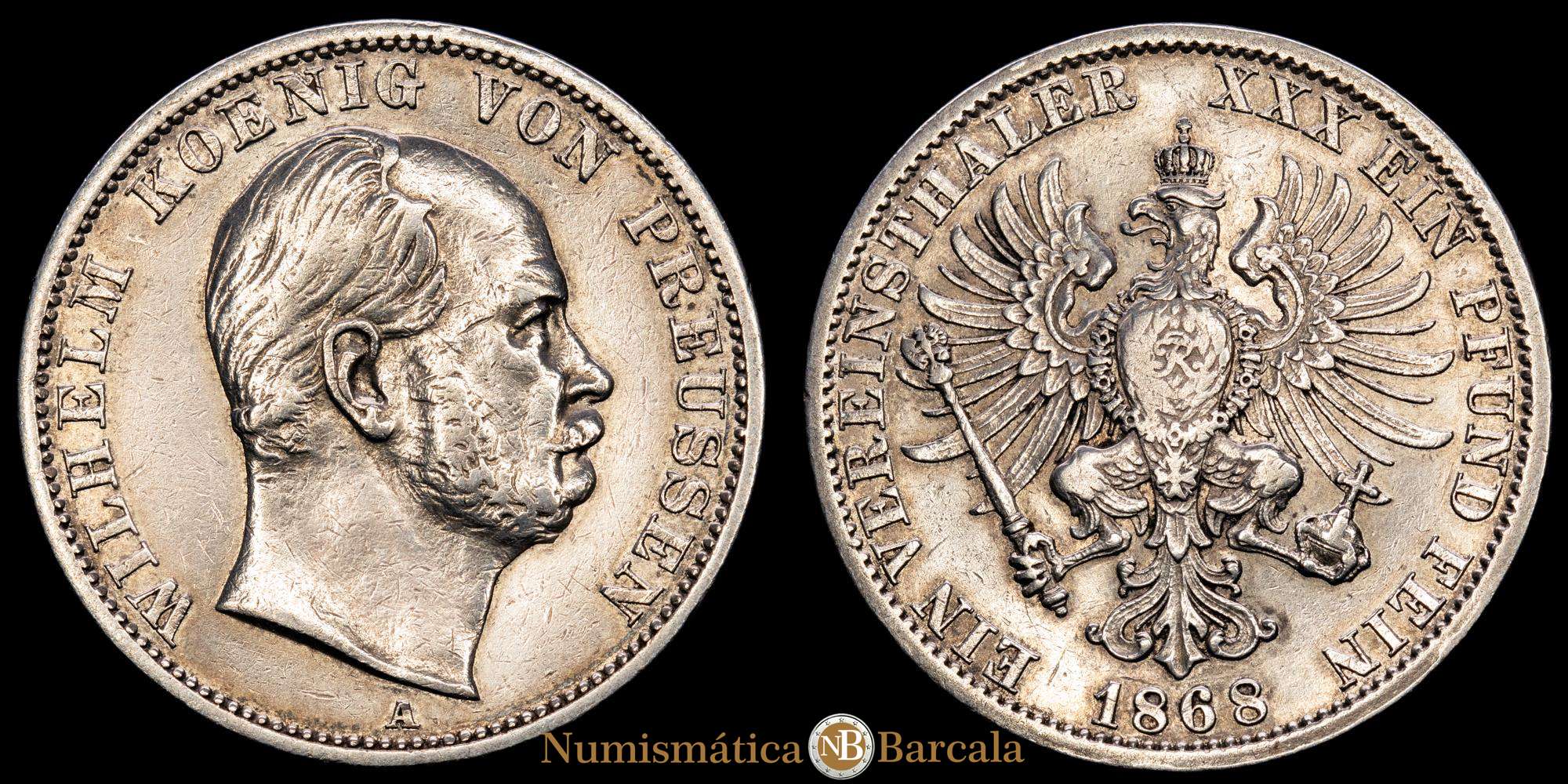 Alemania. Prusia. Guillermo I. 1 tálero. 1868. Berlín. A. (Km-494). Ag. 18,42 gramos. Limpiada. MBC+.