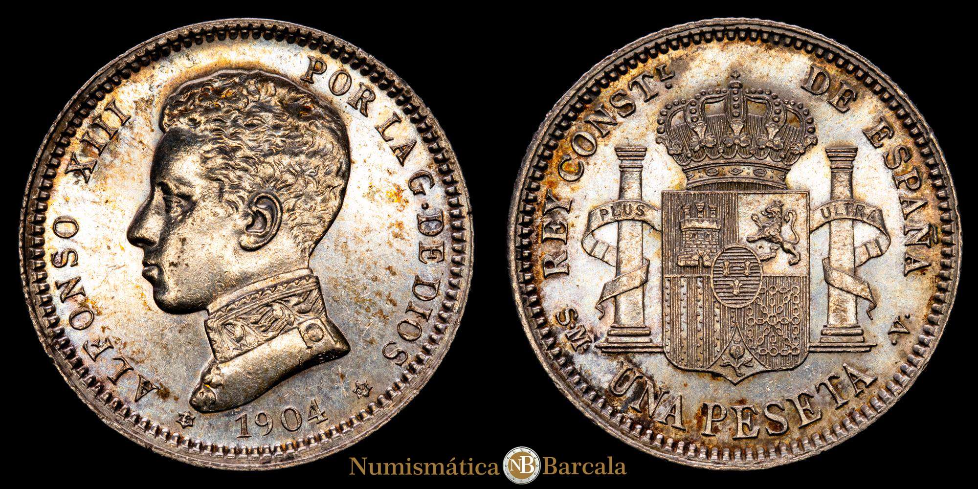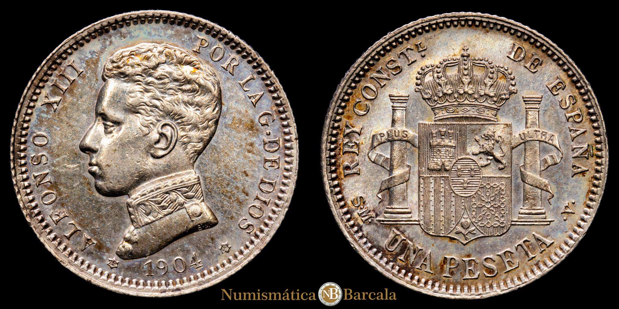 Numismática Barcala > Productos > Alfonso XII. 1 Peseta. (3,01 g.). Madrid. 1904 *19-04*. SM·V. (AC-69). Cero partido. Pleno brillo original. SC. Suave pátina.