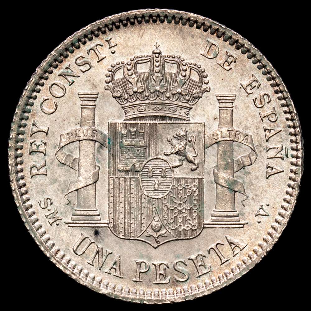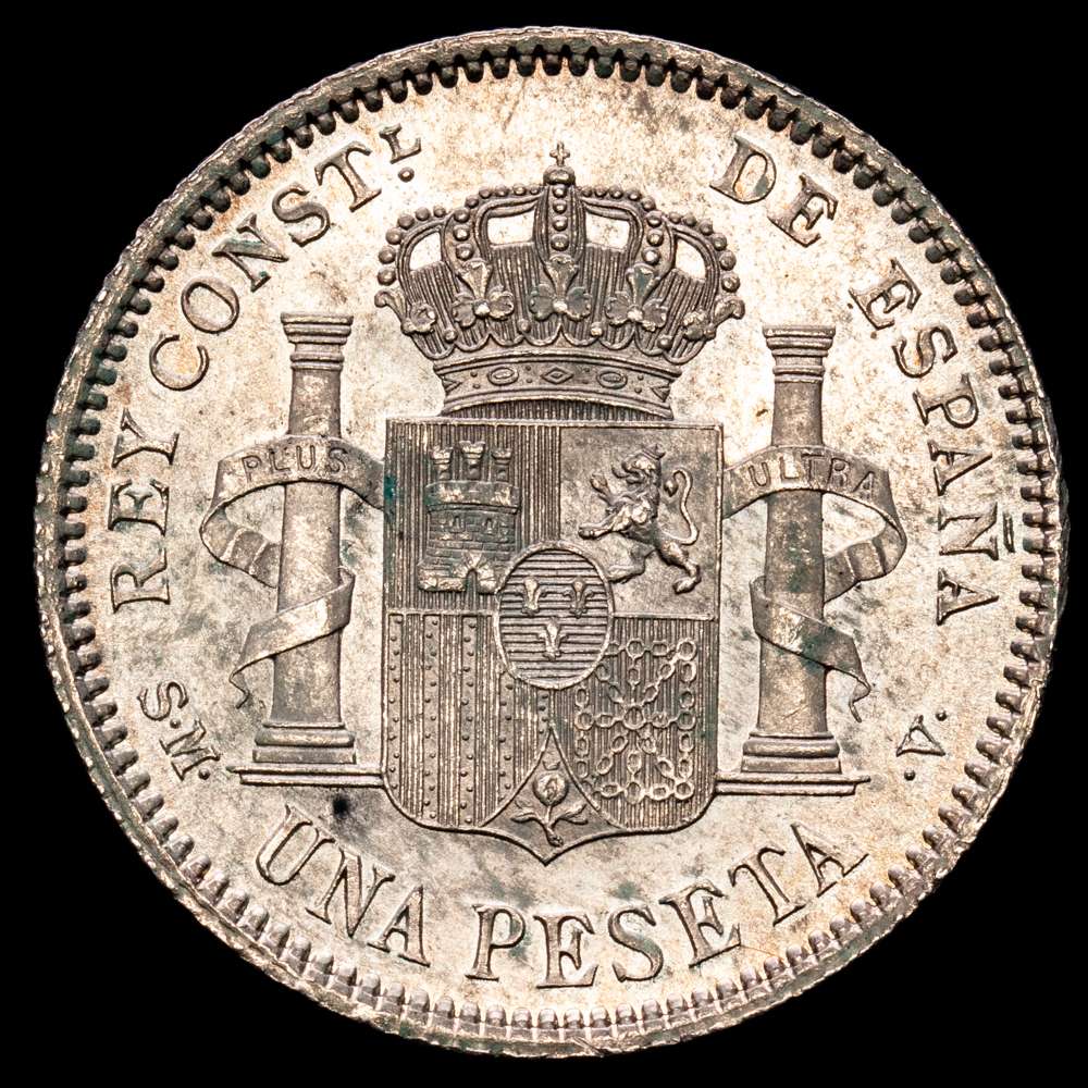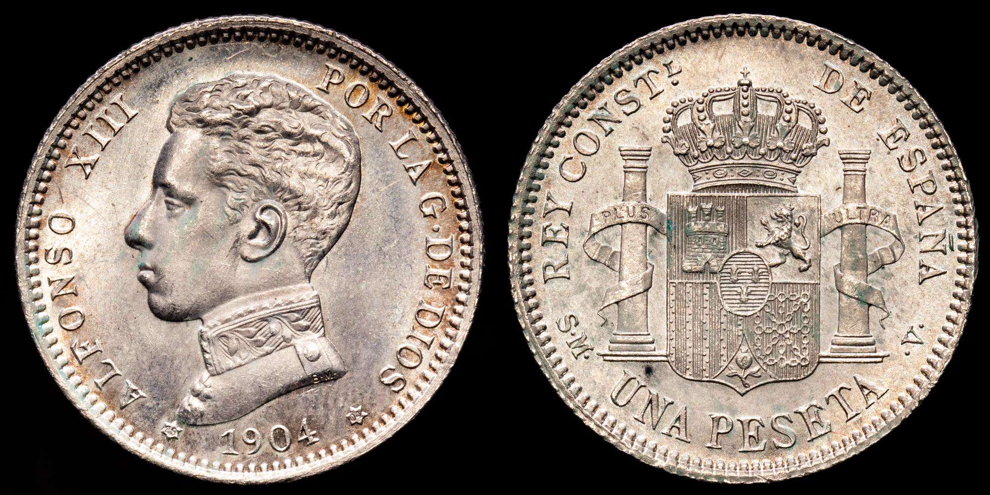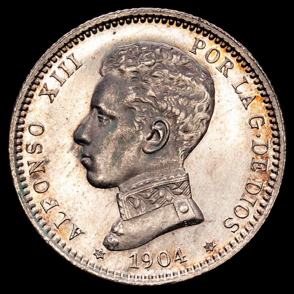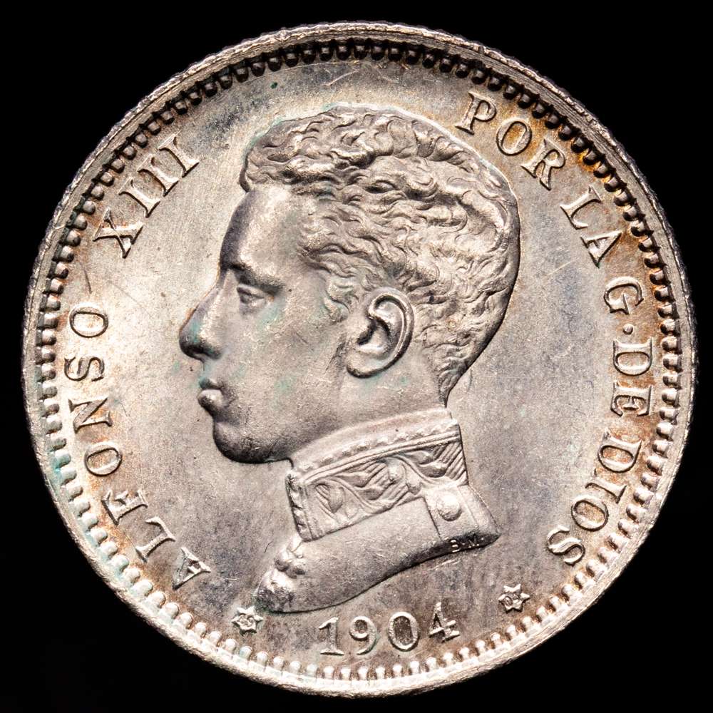 Alfonso XII. 1 Peseta. (4,98 g.). Madrid. 1904 *19-04*. SM·V. (AC-69). Cero partido. Pleno brillo original. SC. Suave pátina.