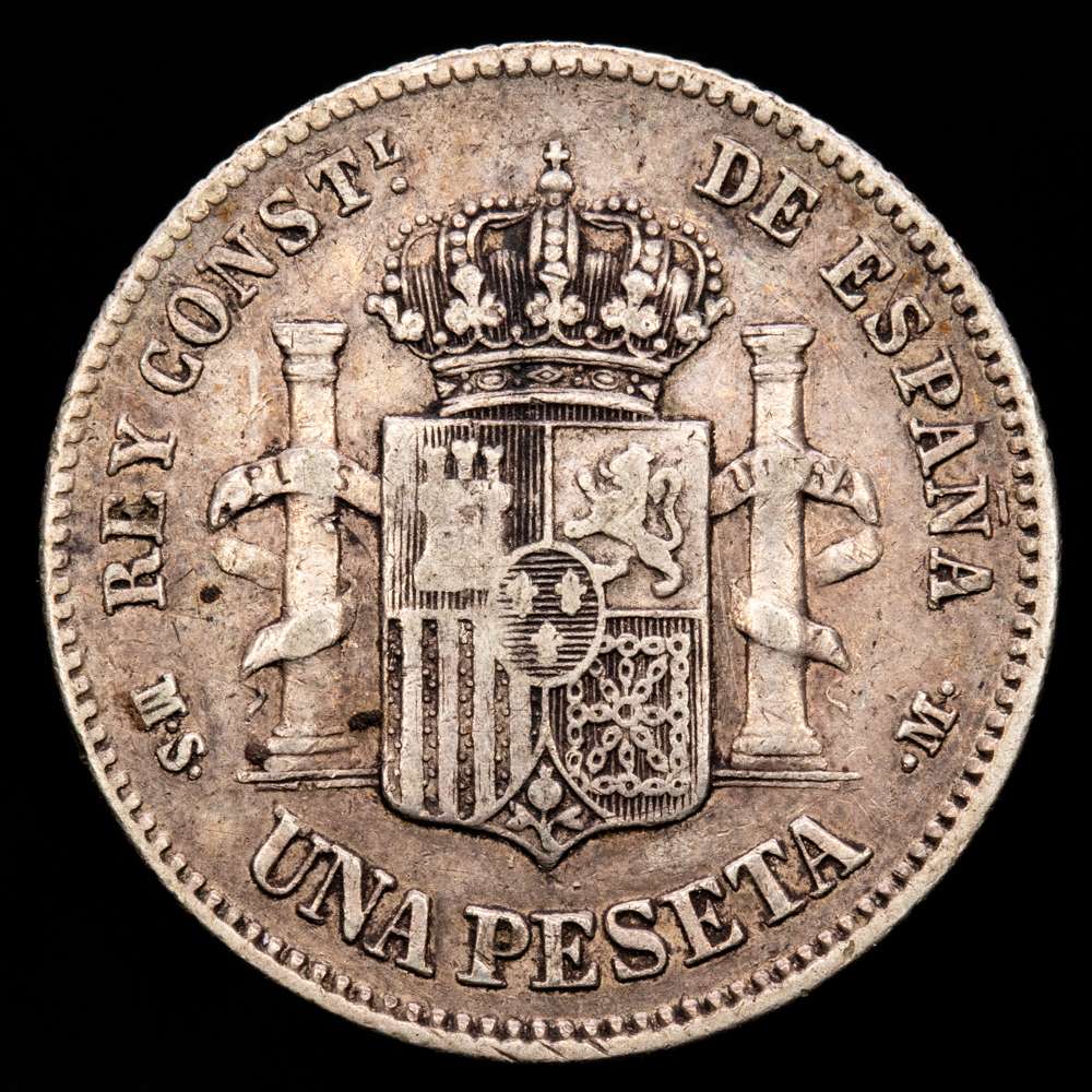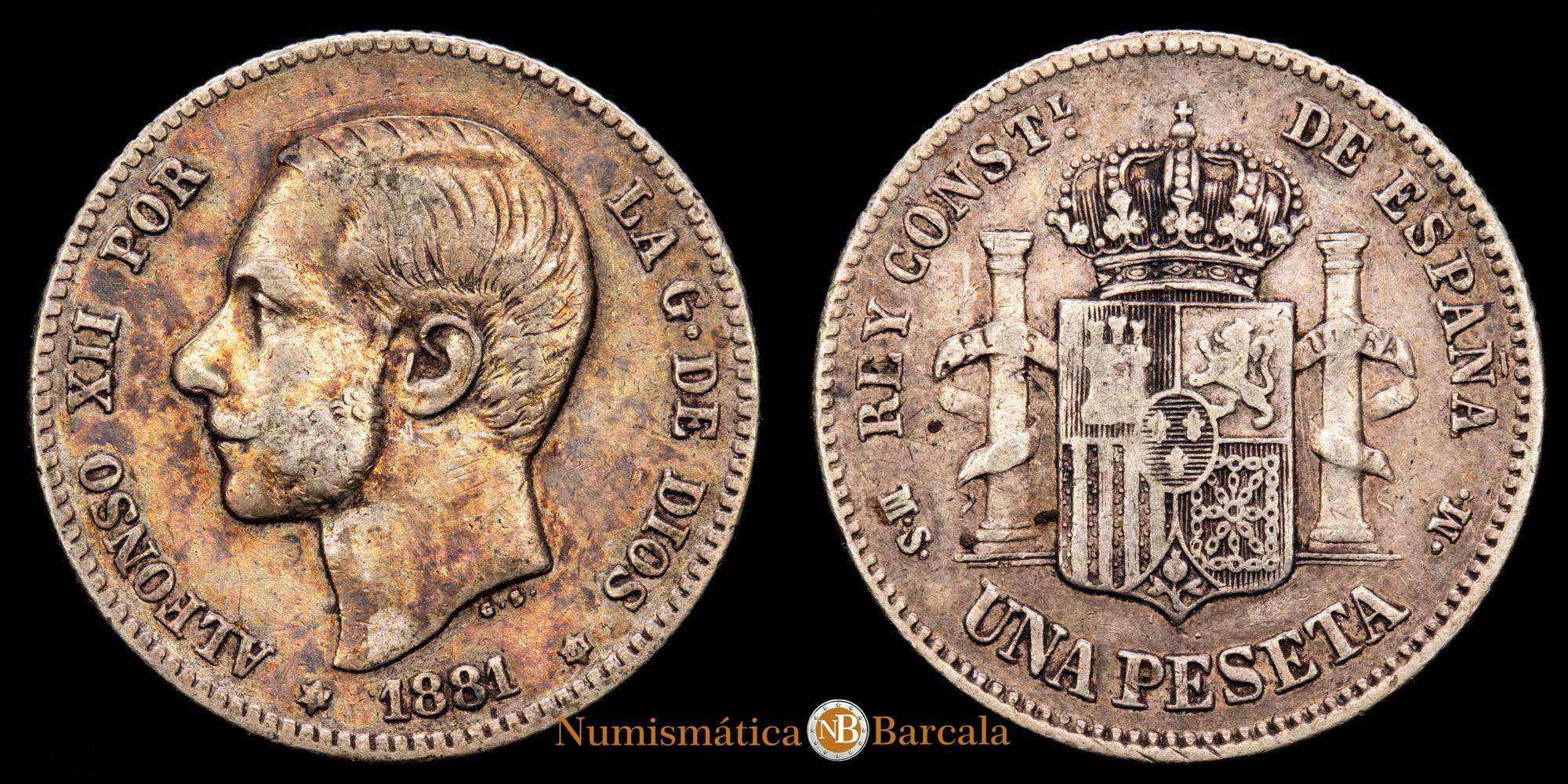 Numismática Barcala > Productos > Alfonso XII. 1 Peseta. (4,99 g.). Madrid. 1881 *_-81*. MS·M. AC-17. 1ª estrella No visible. Pátina. MBC. Escasa.