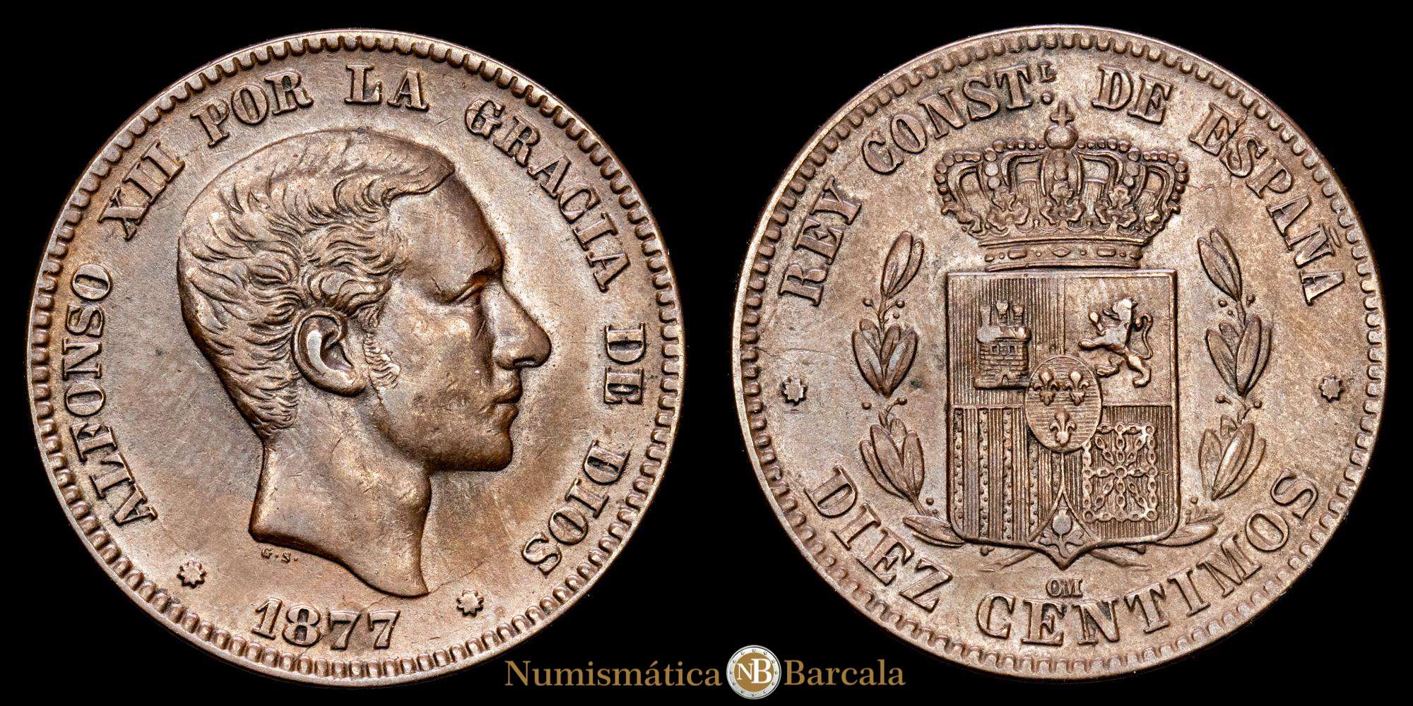Numismática Barcala > Productos > Alfonso XII. 10 Céntimos. (10,26 g.). Barcelona. 1877. Ensayador O·M. Aureo y Calicó-8. MBC+.
