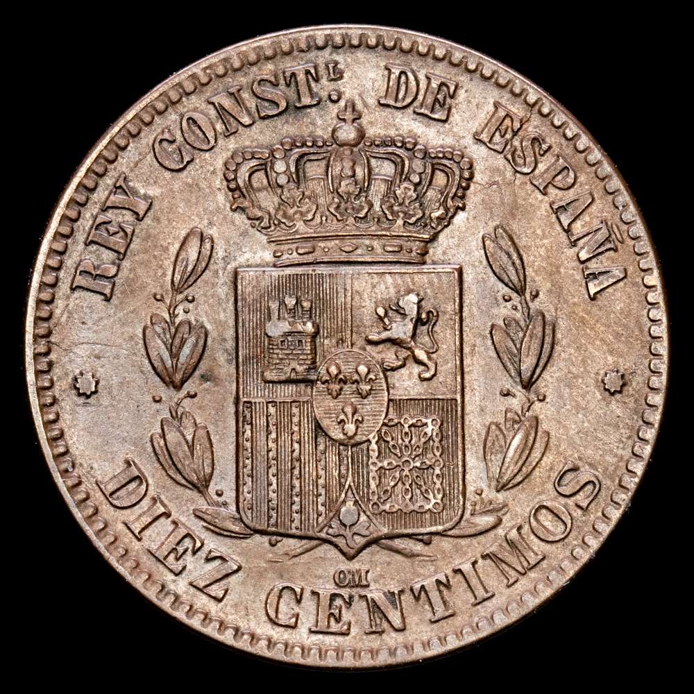 Alfonso XII. 10 Céntimos. (10,16 g.). Barcelona. 1878. Ensayador D·M. Aureo y Calicó – 9. EBC. Restos de brillo original.