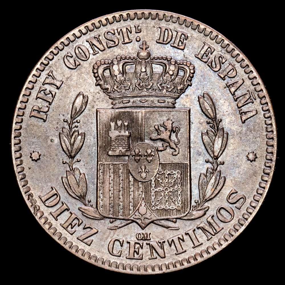 Alfonso XII. 10 Céntimos. (10,16 g.). Barcelona. 1878. Ensayador D·M. Aureo y Calicó – 9. EBC. Restos de brillo original.