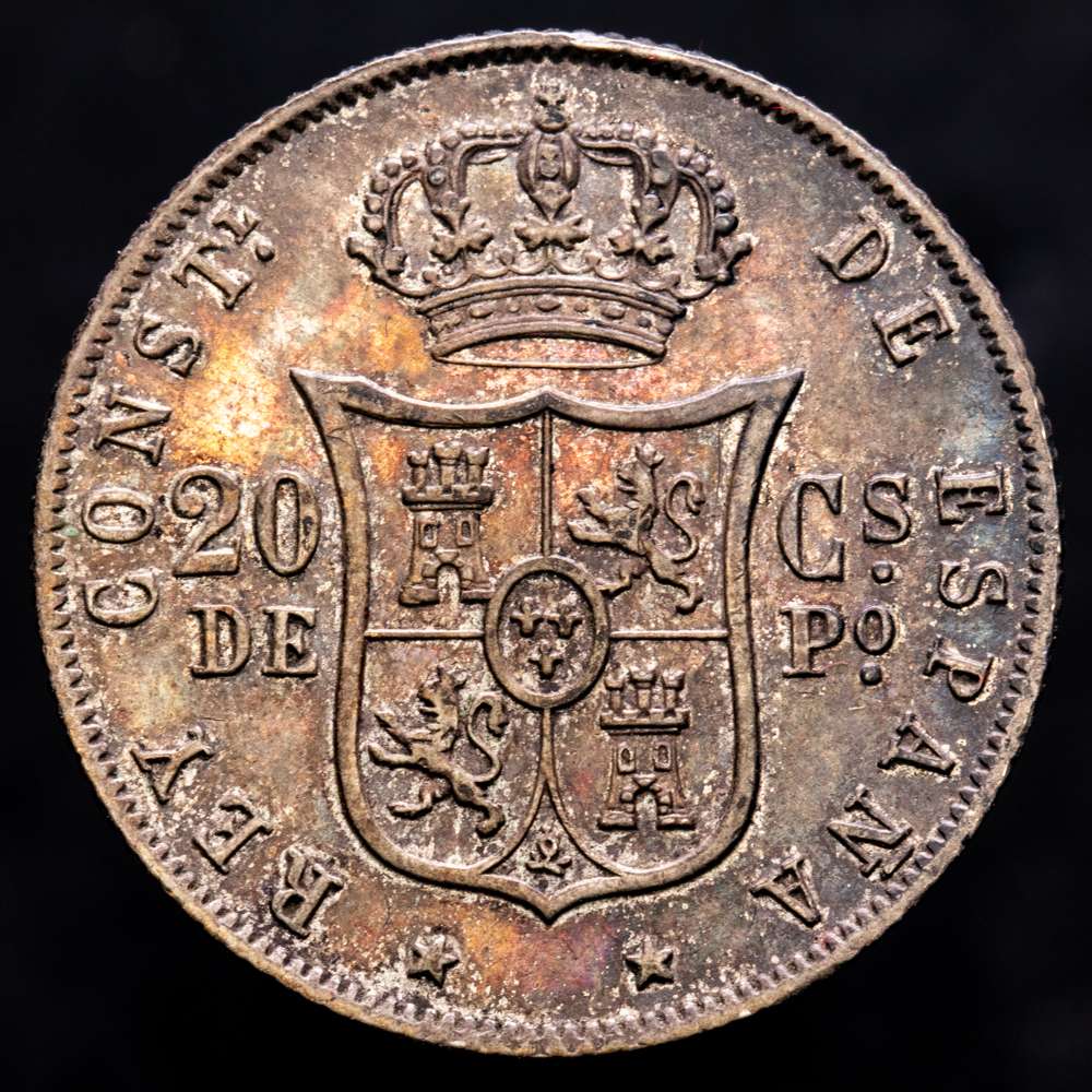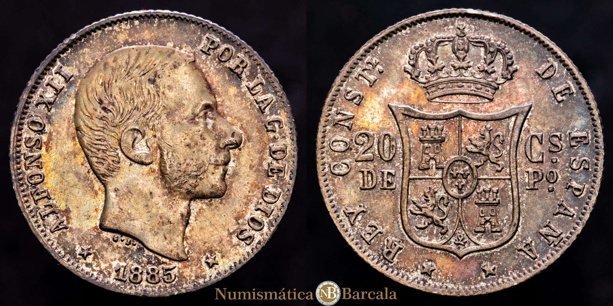 Numismática Barcala > Productos > Alfonso XII (1874-1885). 20 centavos. 1885. Manila. (Cal-111). Ag. 5,15 gramos. Bonito color. EBC-.