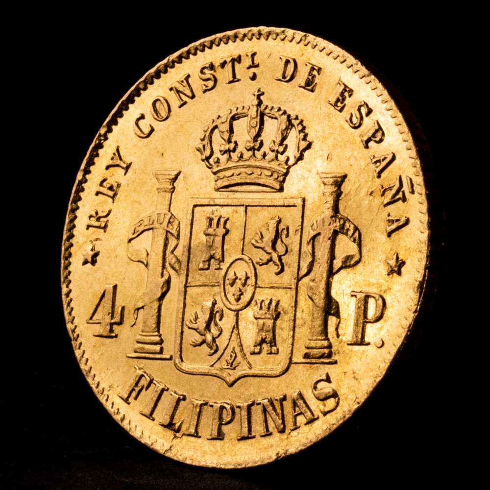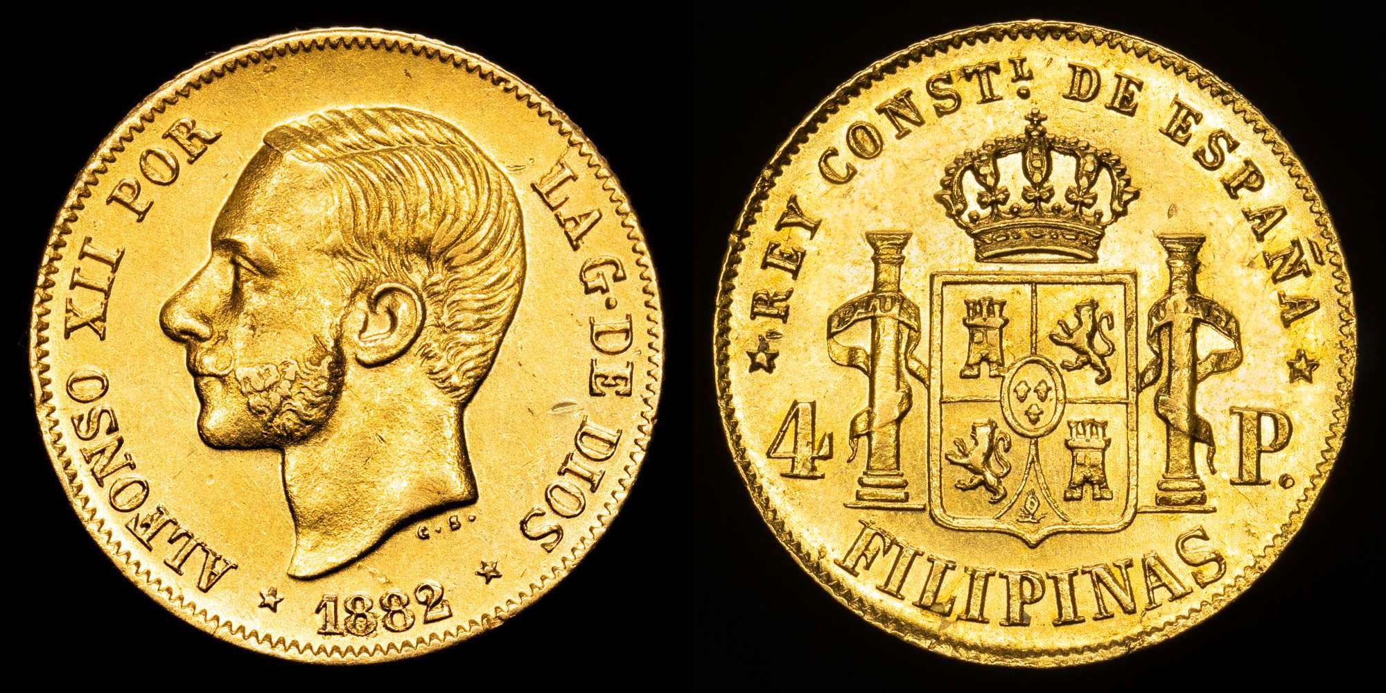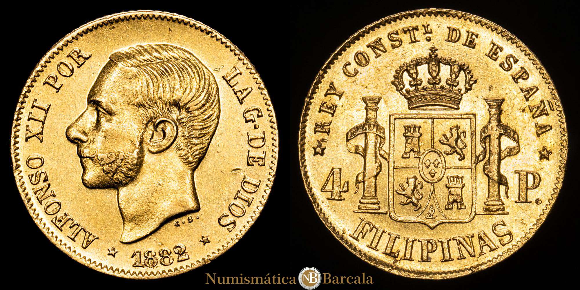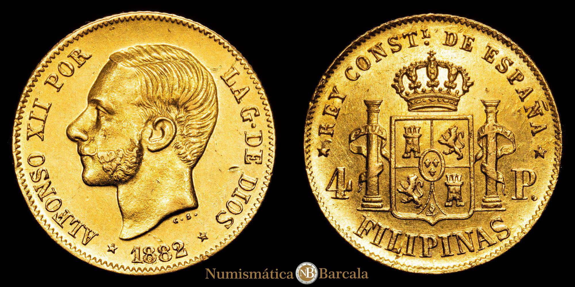 Numismática Barcala > Productos > Alfonso XII (1874-1885). 4 pesos. 1882. Manila. (Cal-127). Au. 6,76 g. Magnífica con pleno brillo original e ínfimas marquitas. Rarísima. EBC+.