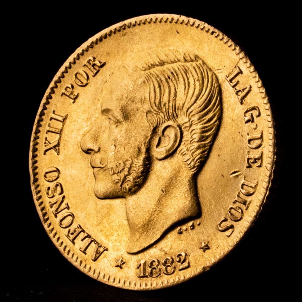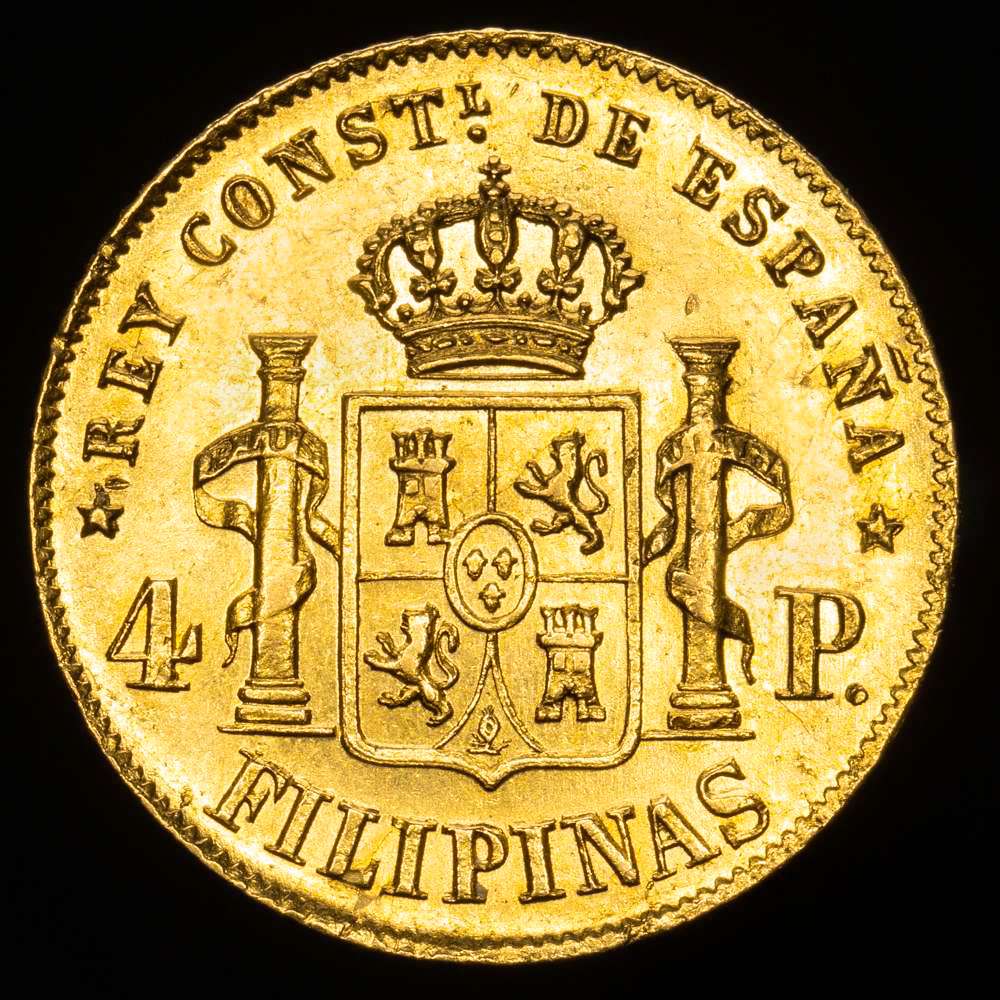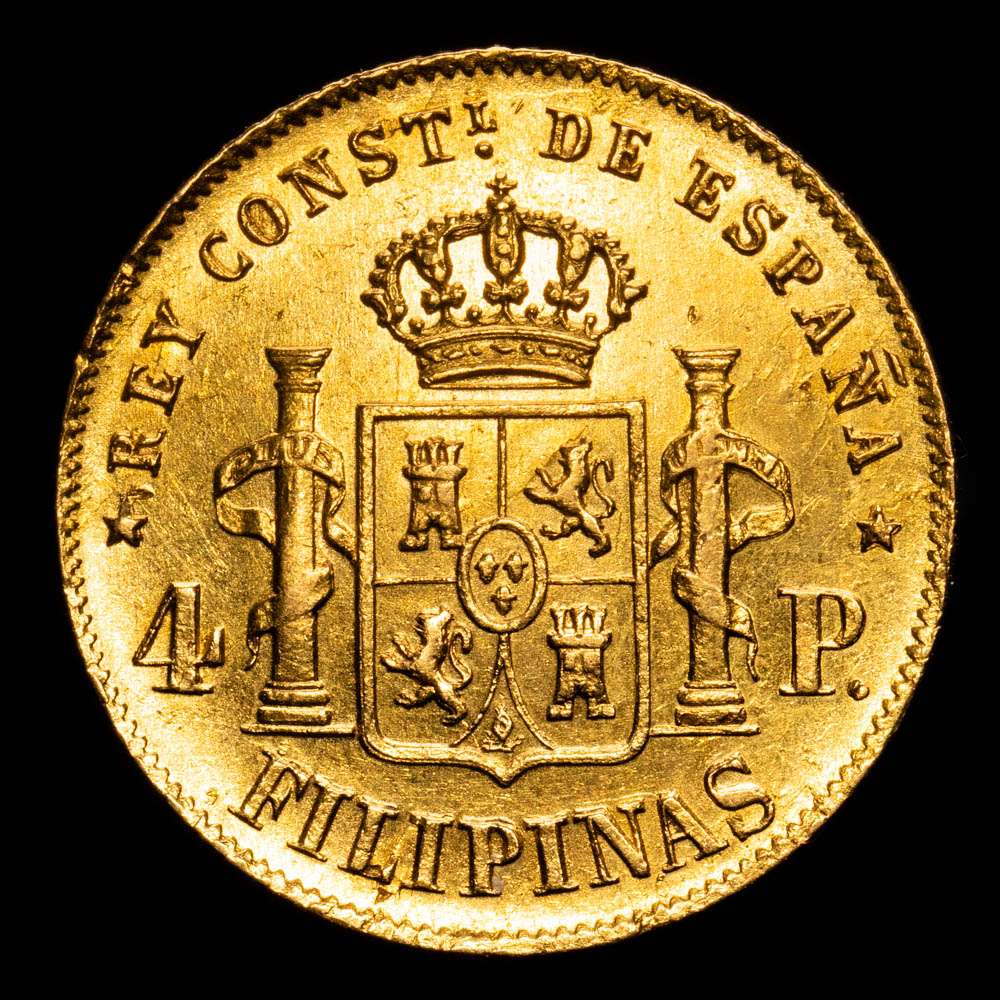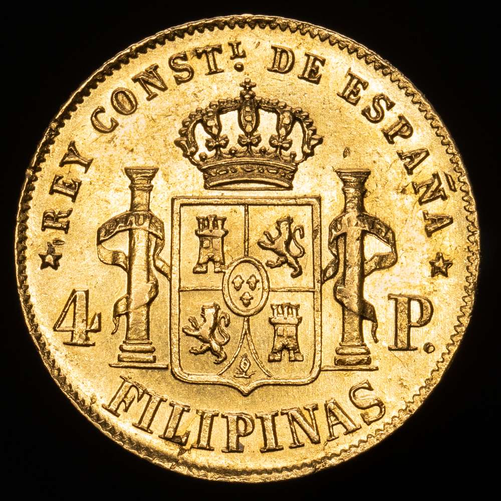 Numismática Barcala > Productos > Alfonso XII (1874-1885). 4 pesos. 1882. Manila. (Cal-127). Au. 6,76 g. Magnífica con pleno brillo original e ínfimas marquitas. Rarísima. EBC+.