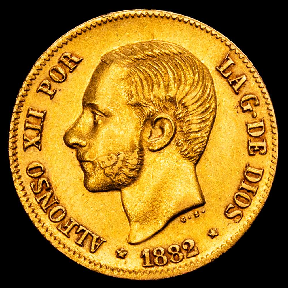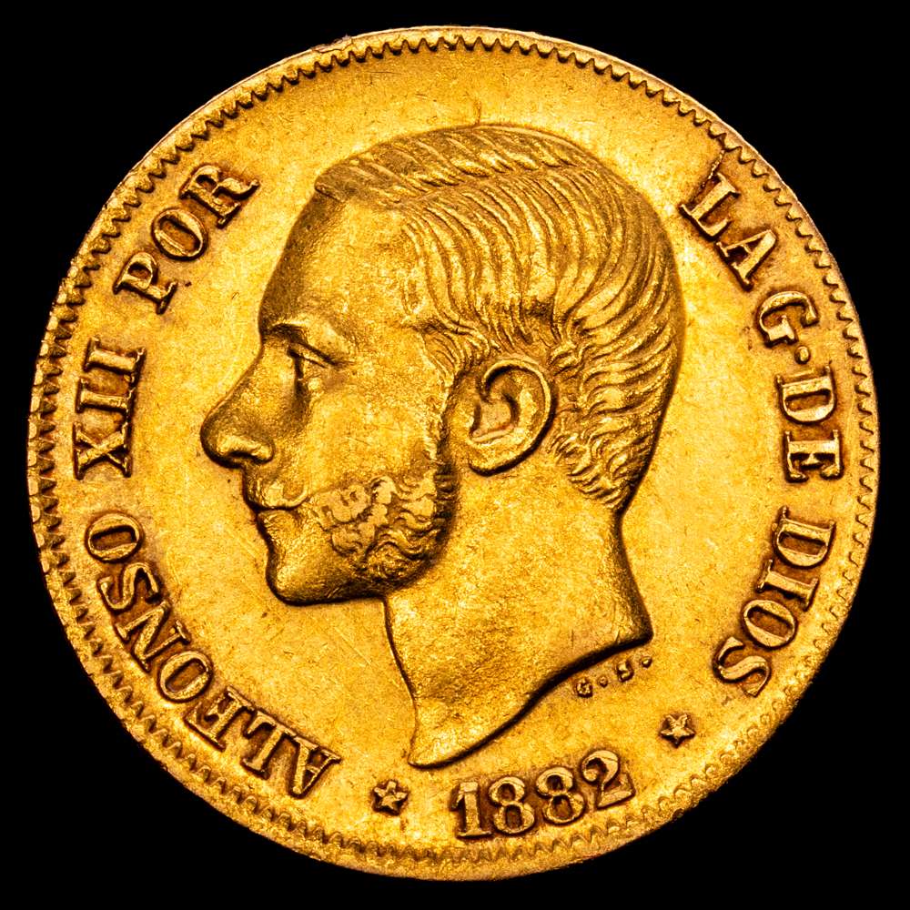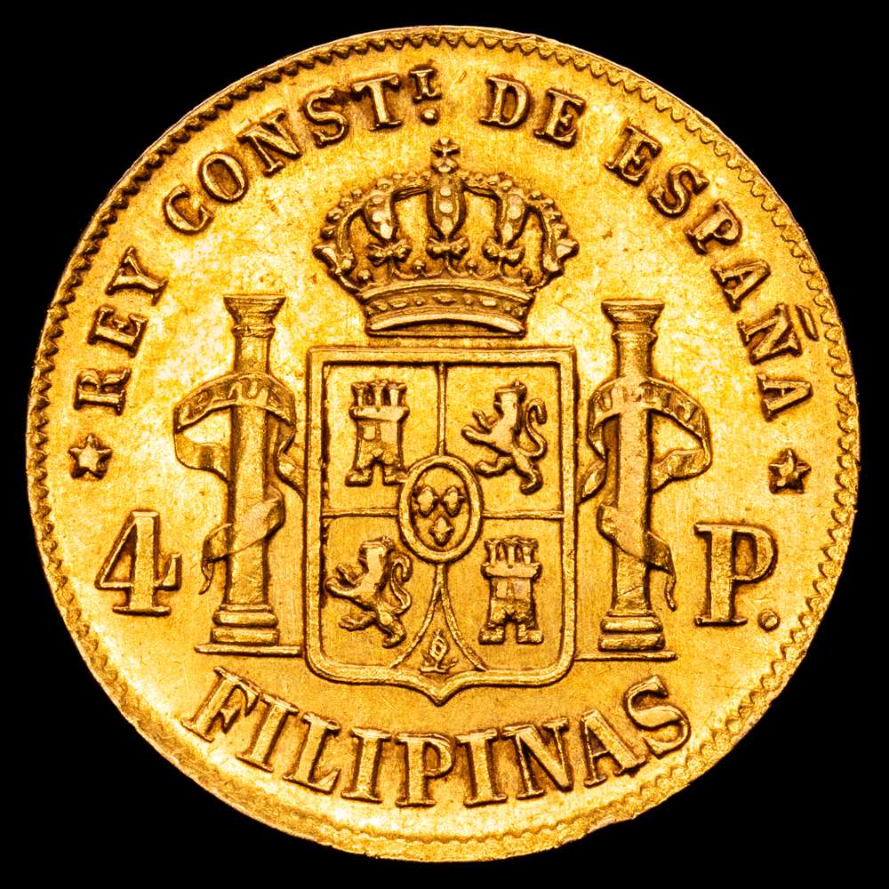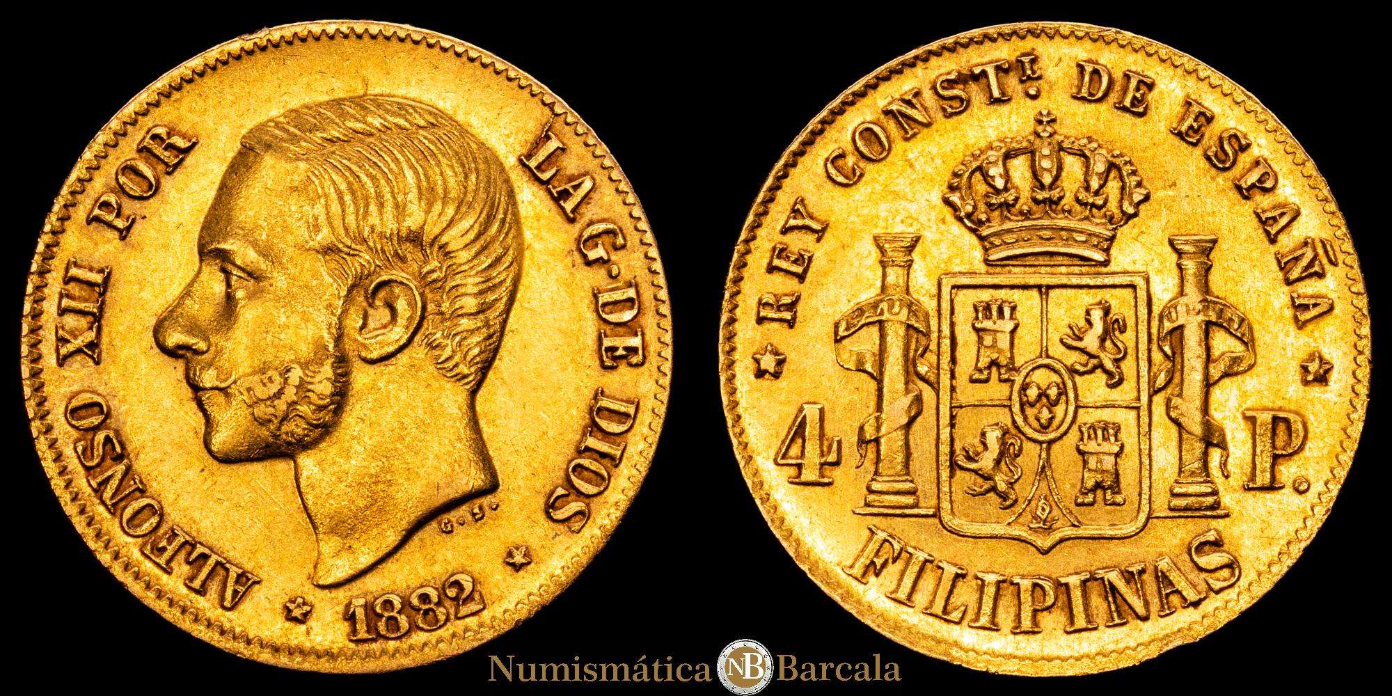 Numismática Barcala > Productos > Alfonso XII (1874-1885). 4 Pesos. 1882. Manila. (Cal-127). Au. 6,79 gramos. Magnífico ejemplar. Hermoso color. Parte de brillo original. Raro. EBC+/EBC.
