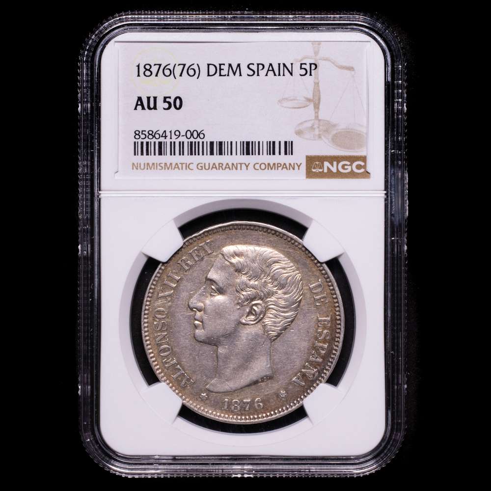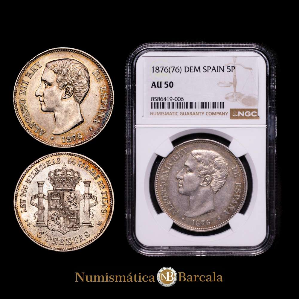 Numismática Barcala > Productos > Alfonso XII (1874-1885). 5 pesetas. 1876*18-76. Madrid. DEM. (Cal-37). Ag. 24,95 g. Bonita pátina. Bello ejemplar. Encapsulada por NGC como AU50.