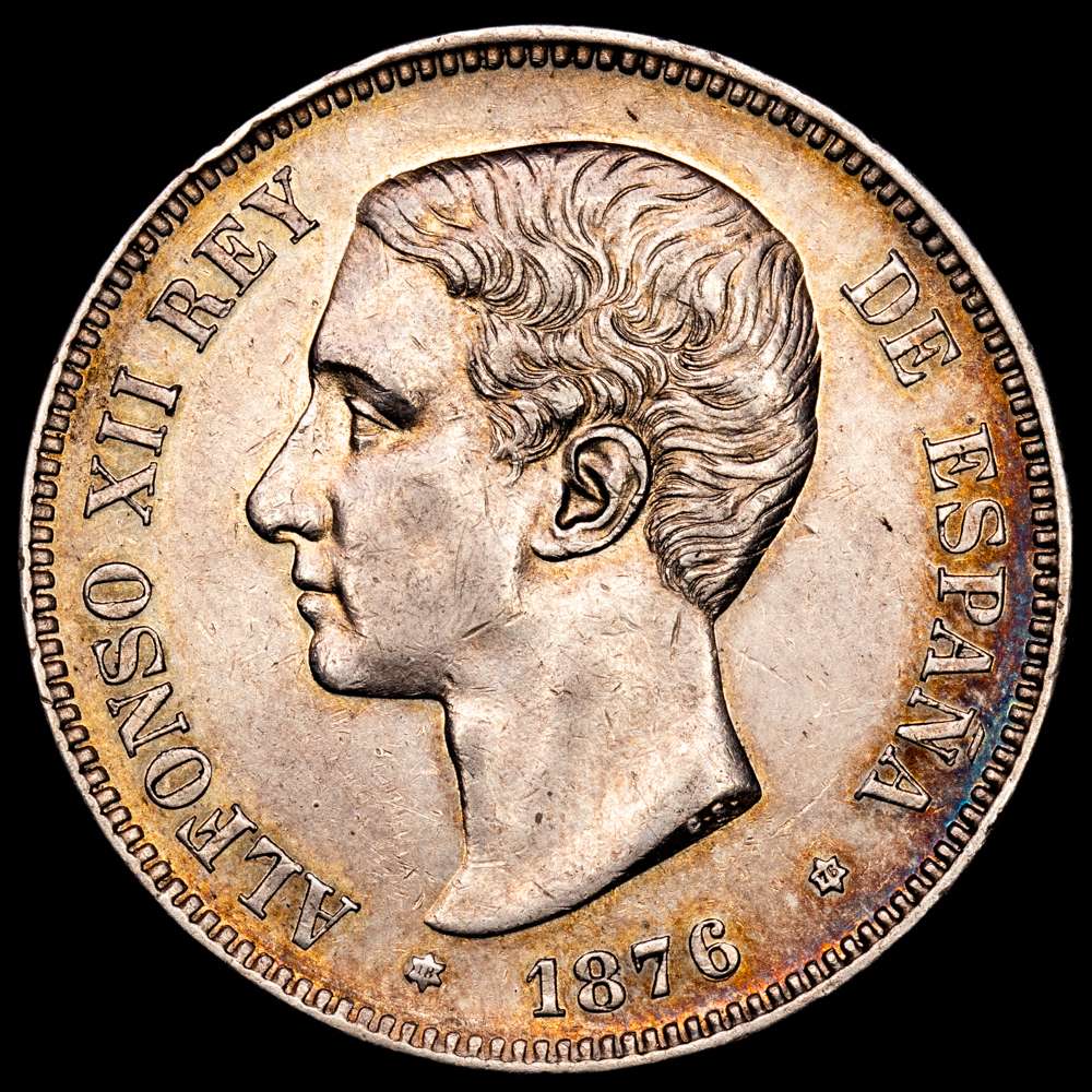 Alfonso XII (1874-1885). 5 pesetas. 1876*18-76. Madrid. DEM. (Cal-37). Ag. 24,95 g. Bonita pátina. Bello ejemplar. Encapsulada por NGC como AU50.