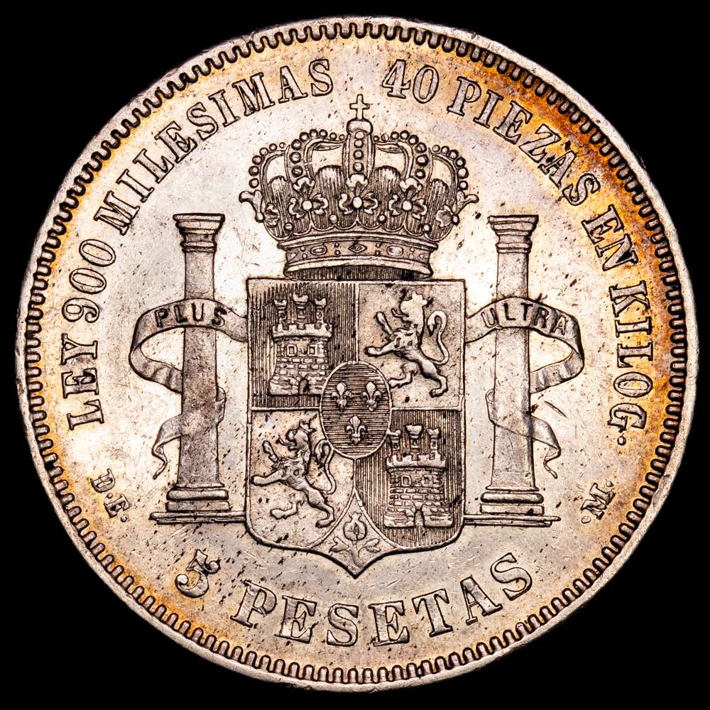 ALFONSO XII. 5 pesetas. 1885*18-87. MSM. (Cal-2019-62). SC, Parte de brillo original .Bello tono. Encapsulada NGC MS61.