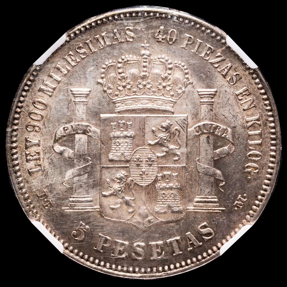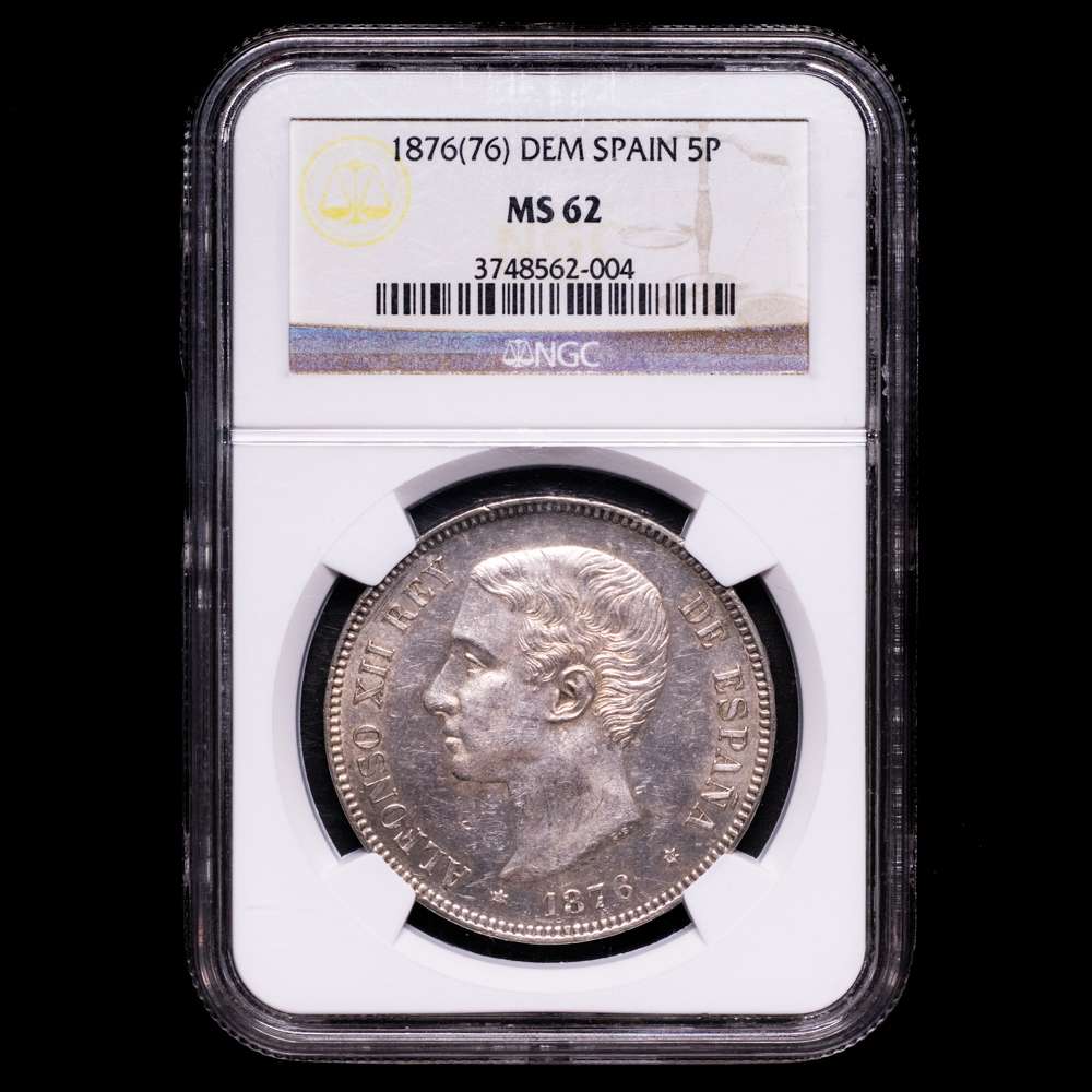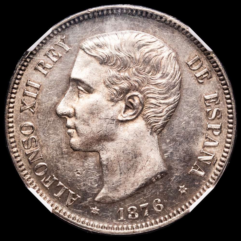 Centenario de la Peseta (1868-1931). Alfonso XII (1874-1885). 5 pesetas. 1876*18-76. Madrid. DEM. (Cal-37). Ag. 24,95 g. Bonita pátina. Brillo original. Precioso ejemplar. Muy rara en esta conservación. Encapsulada por NGC como MS 62.