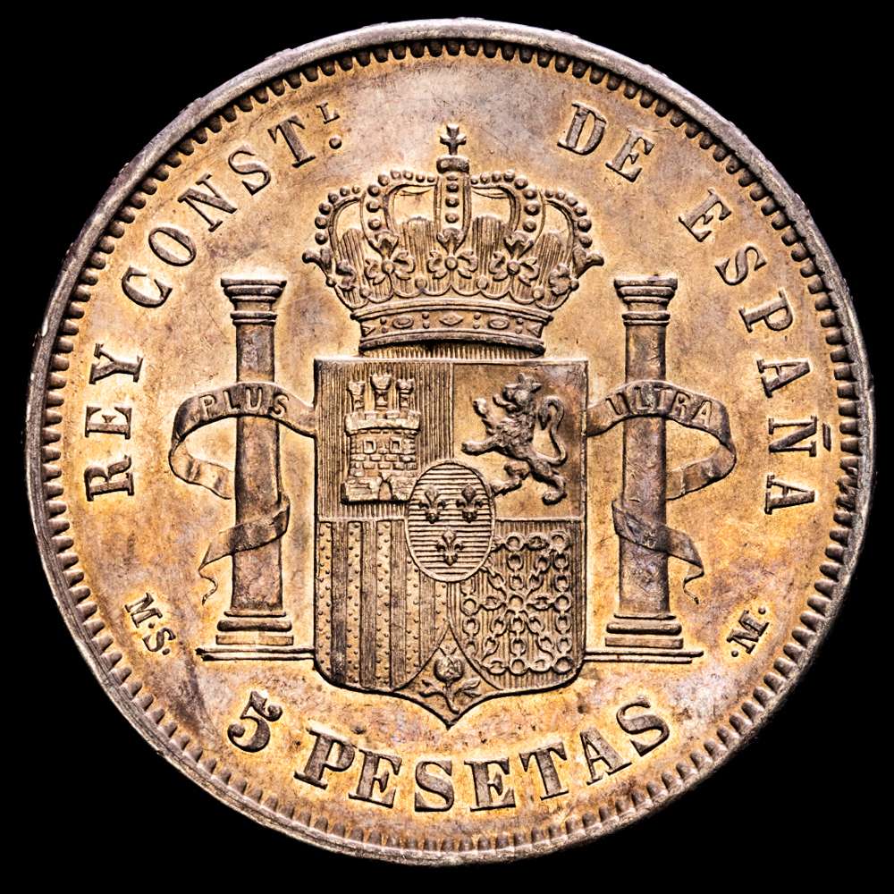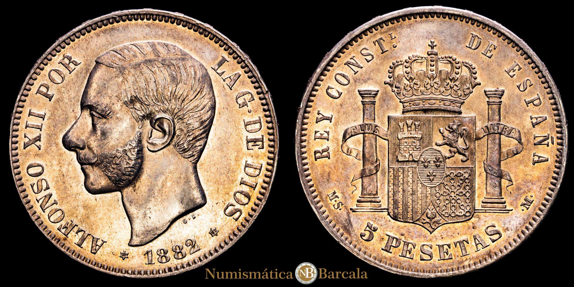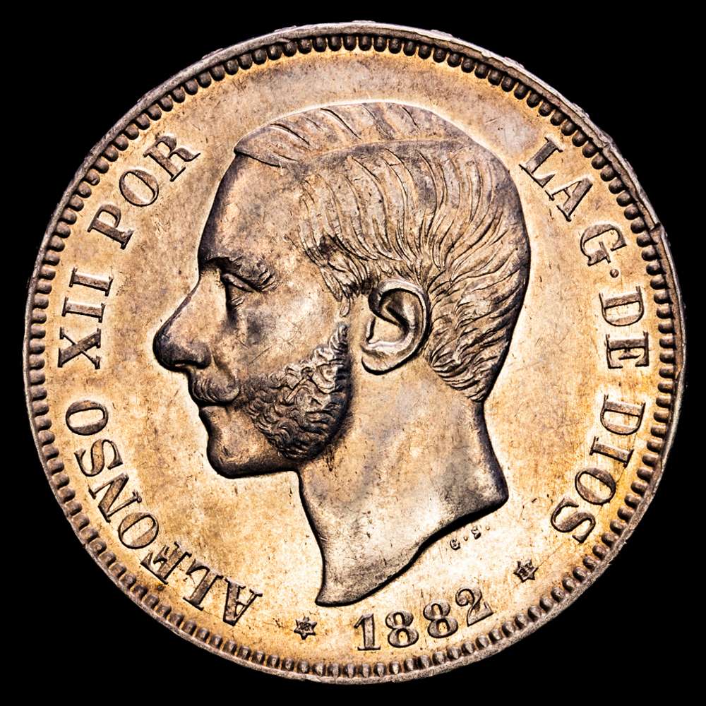 Centenario de la Peseta (1868-1931). Alfonso XII (1874-1885). 5 pesetas. 1882/1*18-82. Madrid. MSM. (Cal-47). Ag. 25,01 gramos. Restos del brillo original con tono suave. Leves marquitas. Escasa así. Muy bella. EBC+.