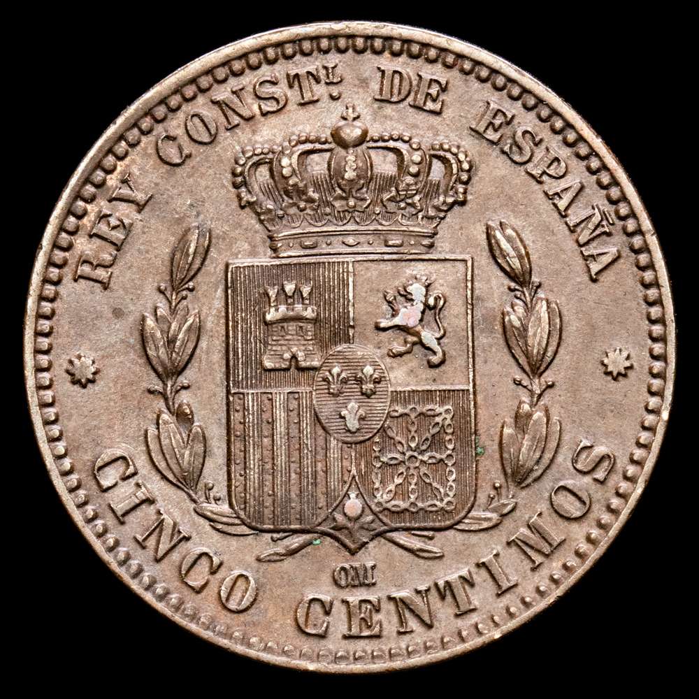 Alfonso XII. 5 Céntimos. (4,98 g.). Barcelona. 1877. O·M. AC-4. EBC-. Escaso. Bonito ejemplar