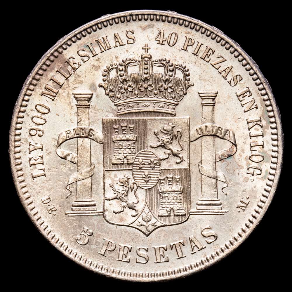 Alfonso XII. 5 Pesetas. (24,83 g.). Madrid. 1875 *18-75*. Ensayador DE·M. Aureo y Calicó-35. EBC+. Muy bella