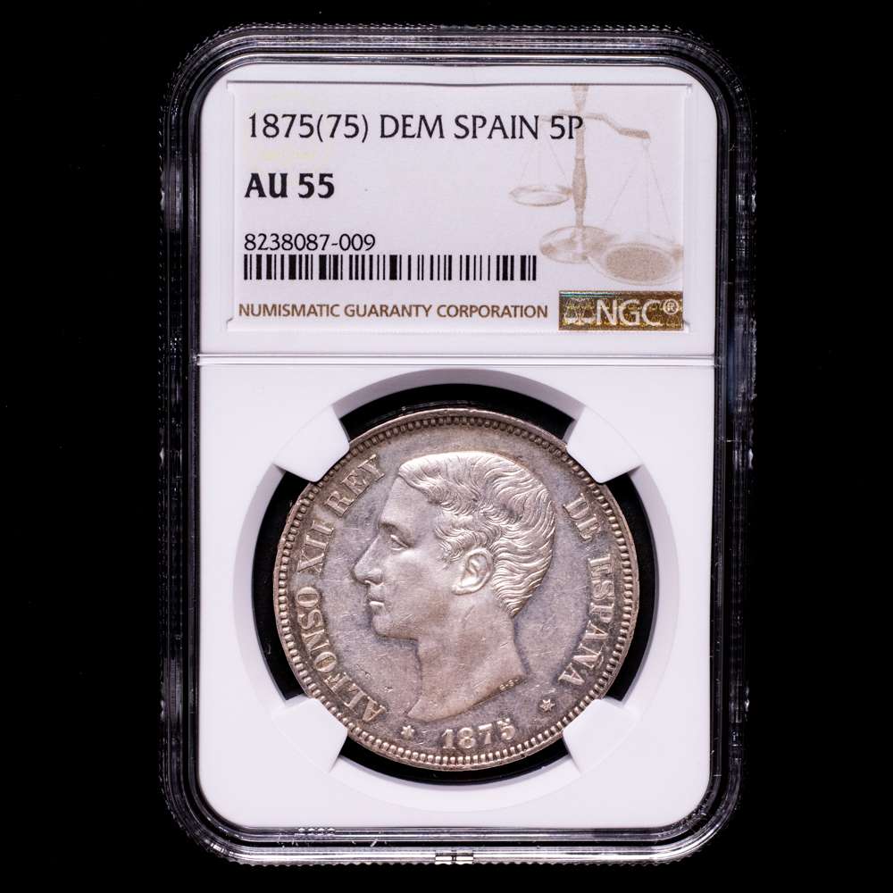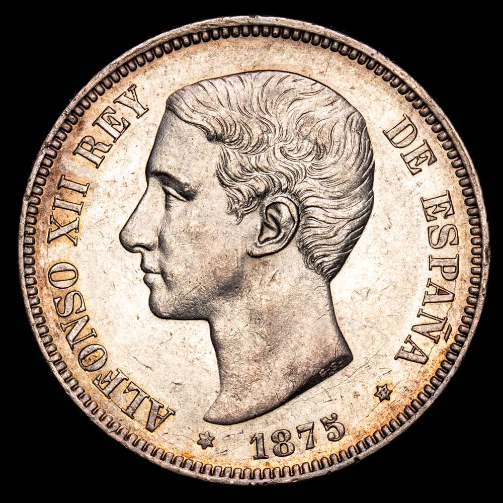 Alfonso XII. 5 Pesetas. Madrid. 1875 *(-)8-75). DE-M. (AC. 35). Ligera pátina. Escasa así. Encapsulada por NGC como AU55.