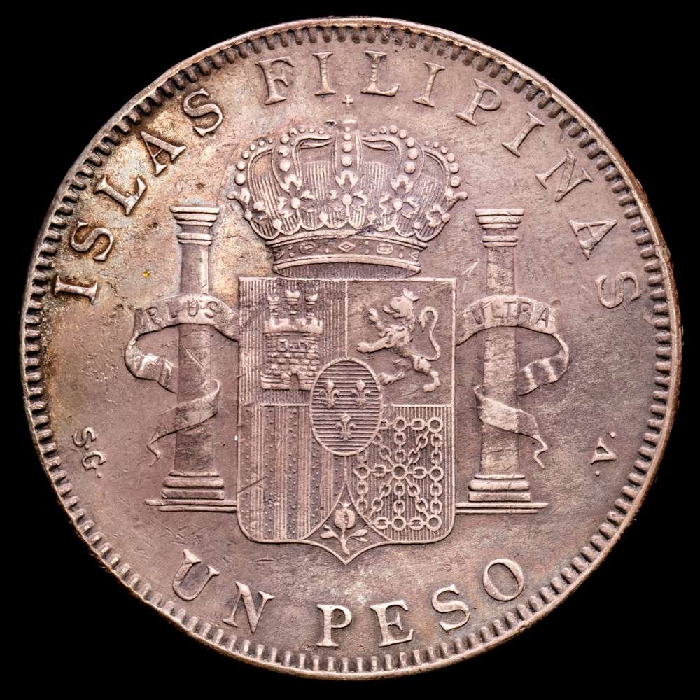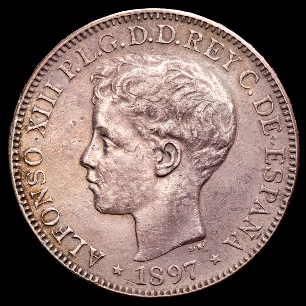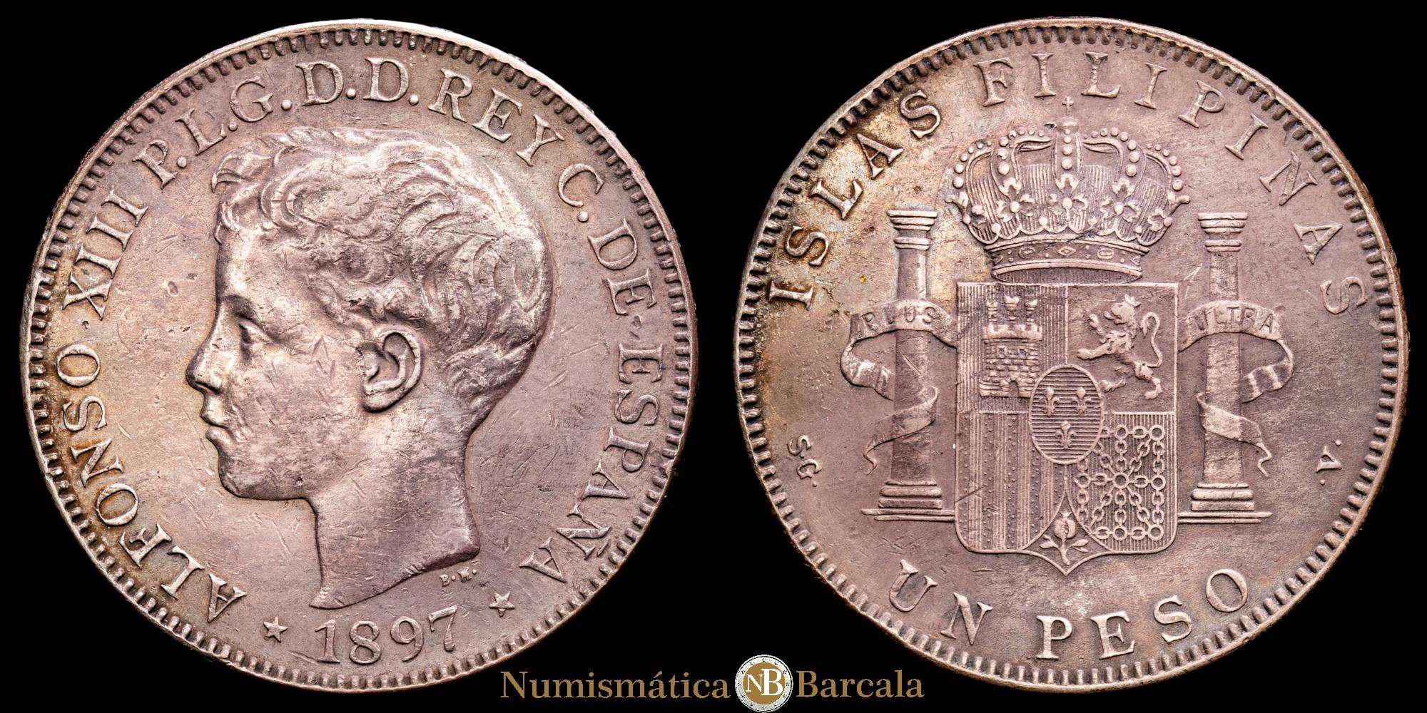 Alfonso XIII (1886-1931). 1 Peso. 1897. Manila. SGV. (Cal-122). Ag. 24,69 gramos. Pátina oscura. MBC+.