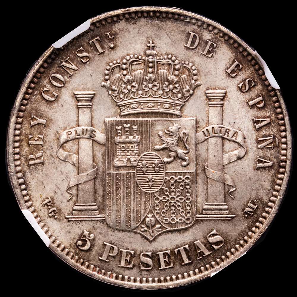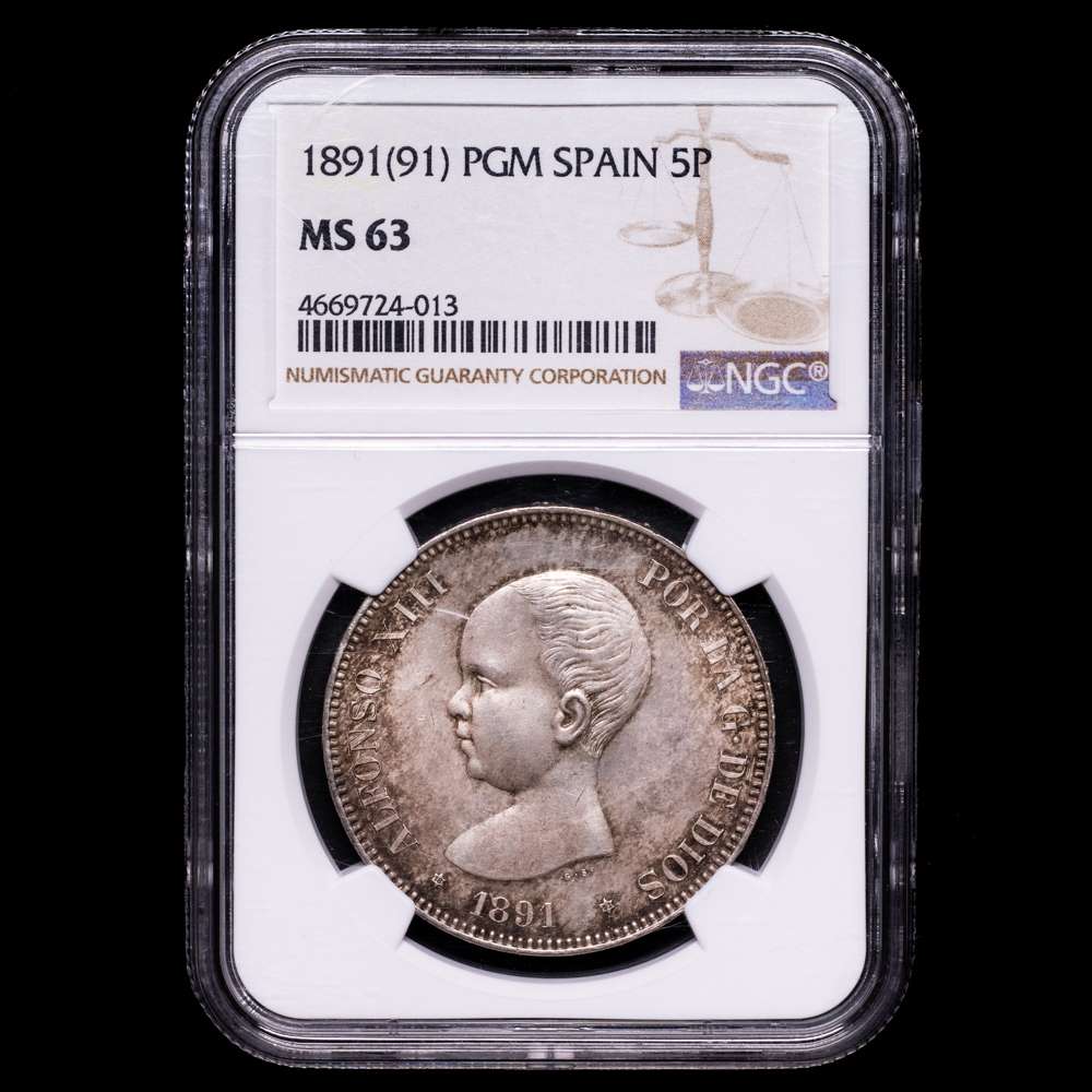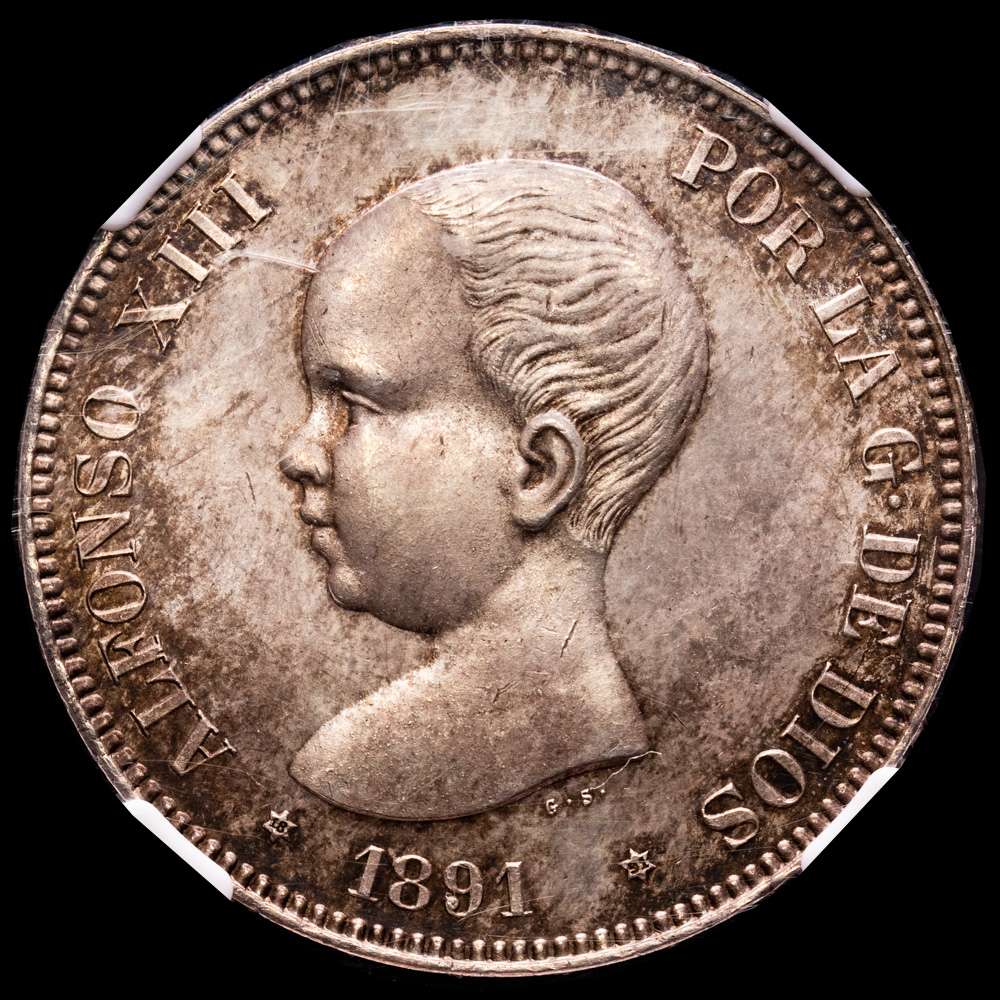 Centenario de la Peseta (1868-1931). Alfonso XIII (1886-1931). 5 pesetas. 1891*18-91. Madrid. PGM. (Cal-98). Ag. 24,95 g. Parte del brillo original. Pátina oscura. Encapsulada por NGC como MS63.