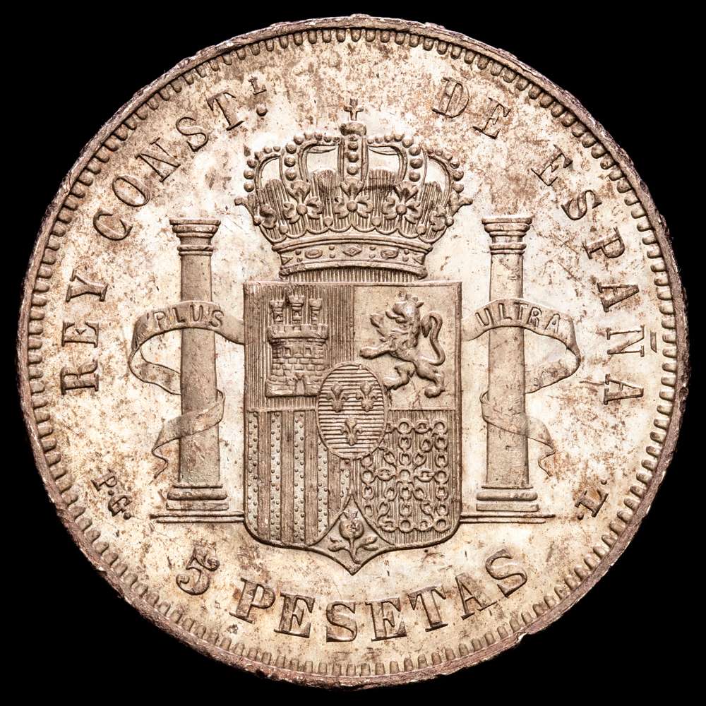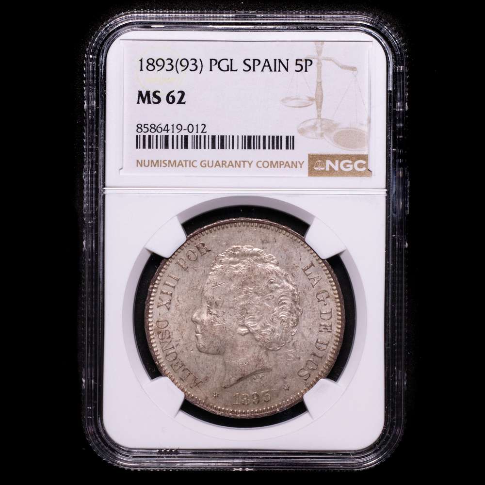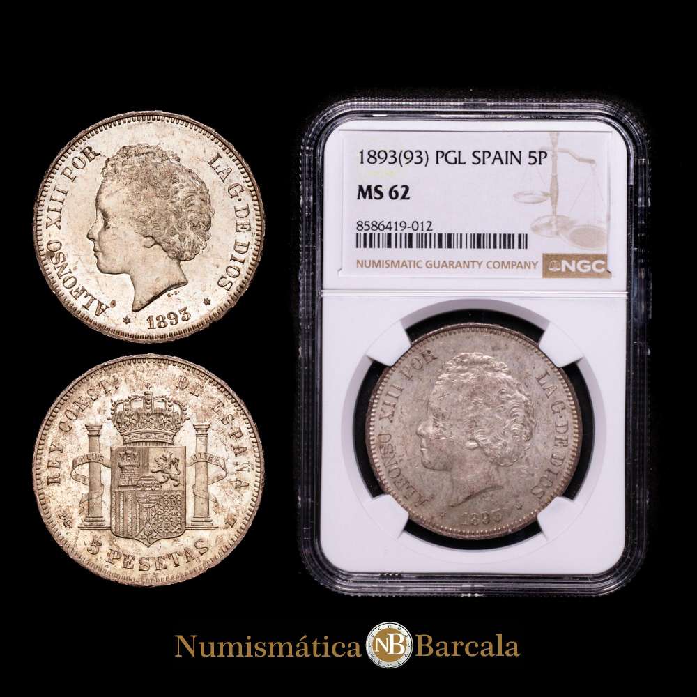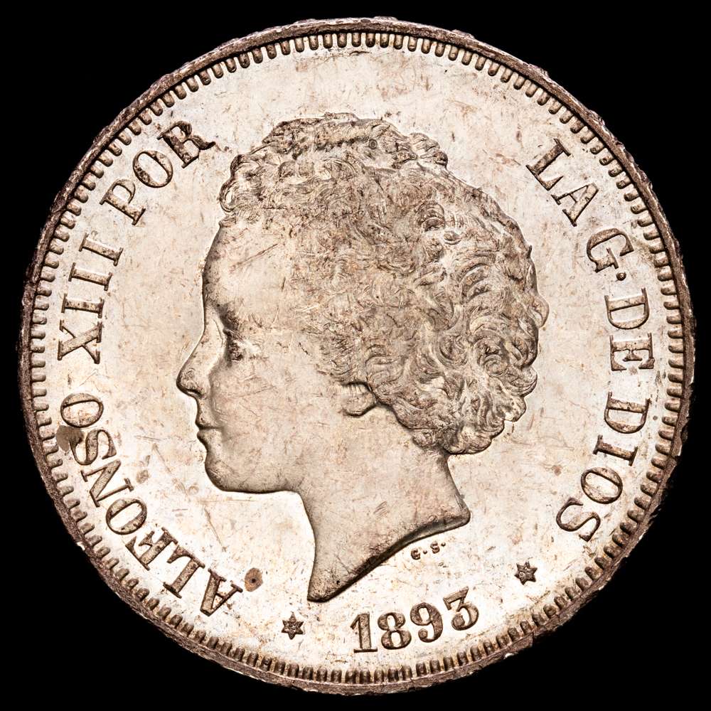 Alfonso XIII (1886-1931). 5 pesetas. 1893*18-93. Madrid. PGL. (AC-102). Ag. 24,99 g. Gran brillo original. Encapsulada por NGC como MS 62. Escaso en esta condición.