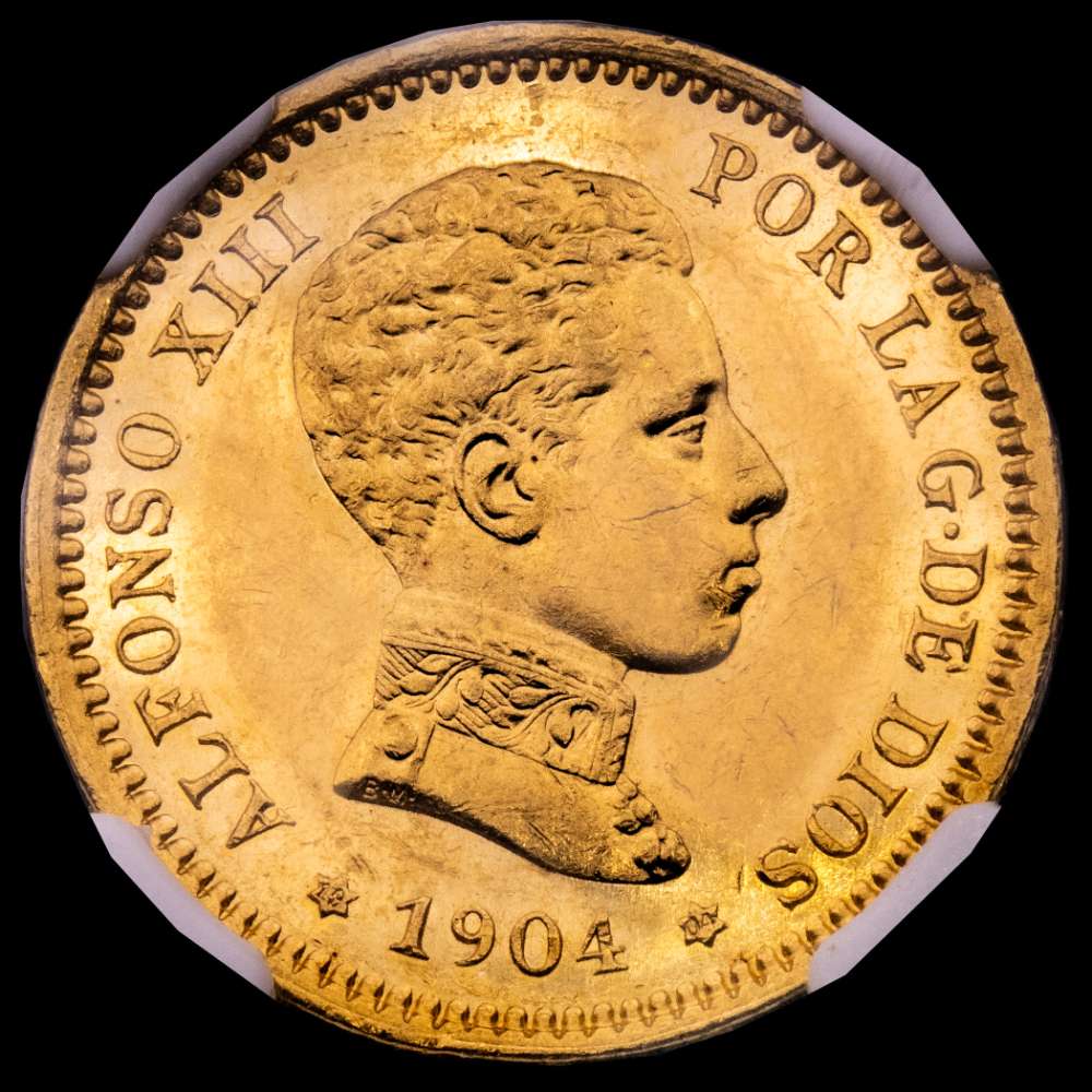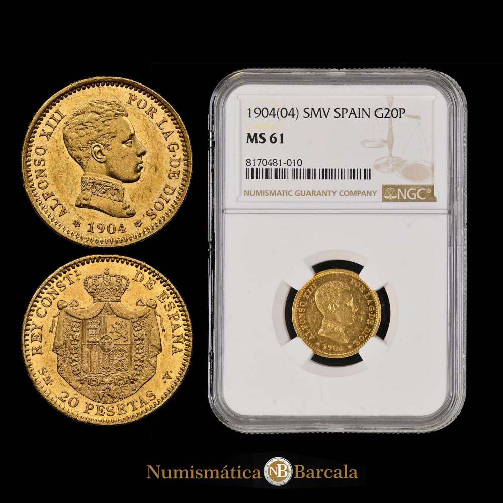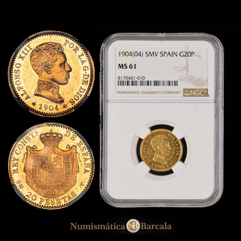 Numismática Barcala > Productos > Alfonso XIII. 20 Pesetas. ( g.). Madrid. 1904(04). SM·V. Cal-117. MS61. Tipo “cadete”. Brillo original. Rara y más en este estado.