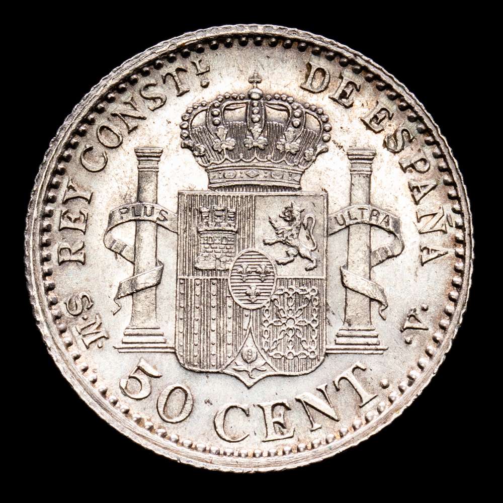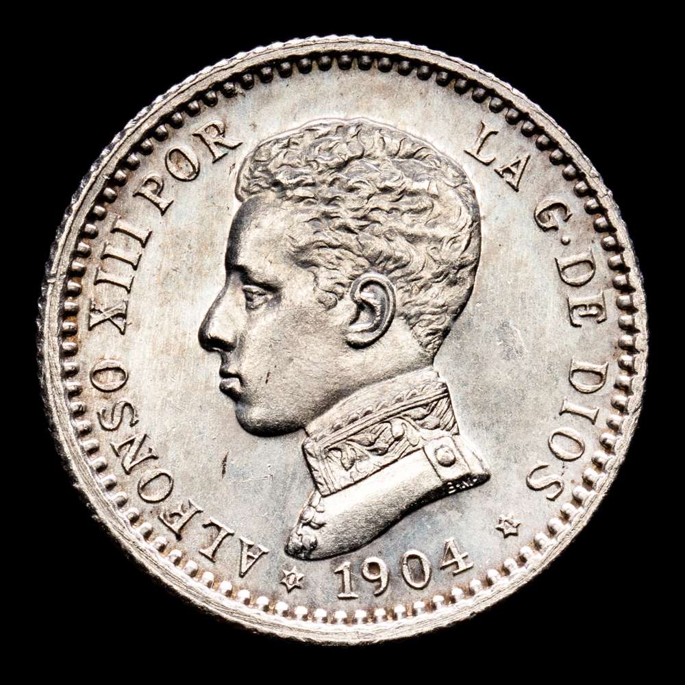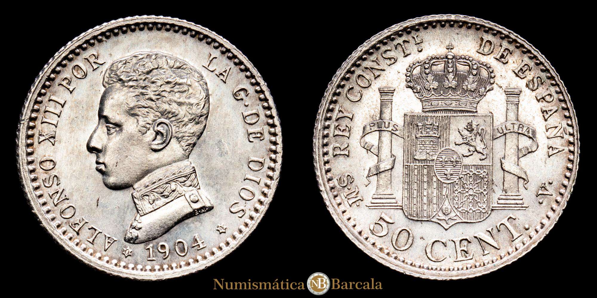 Alfonso XIII. 50 Céntimos. (2,48 g.). Madrid. 1904 *0-4*. Ensayador SM.V. Aureo y Calicó – 46. SC-. Brillo original