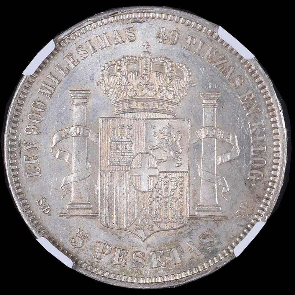 Centenario de la Peseta (1868-1931). Amadeo I (1871-1873). 5 pesetas. 1871*18-71. Madrid. SDM. (Cal-1). Ag. Suave pátina de monetario. Restos de brillo original. Encapsulada por NGC como MS 62.