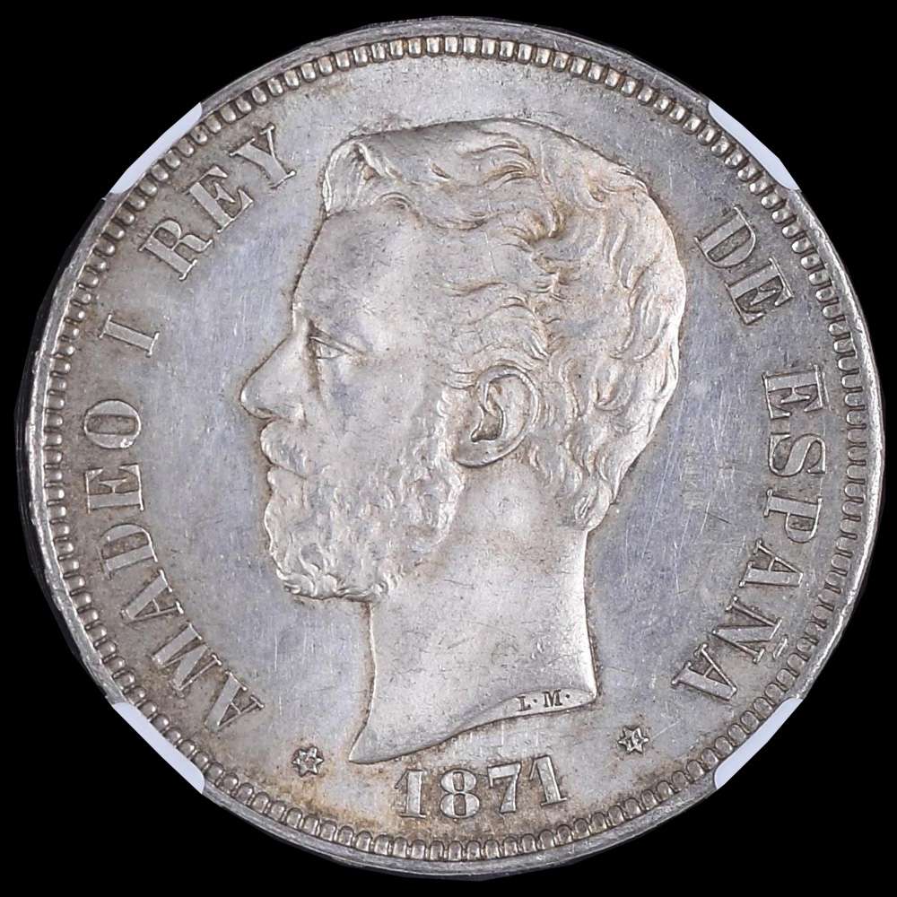 Numismática Barcala > Productos > Amadeo I (1871-1873). 5 pesetas. 1871*18-71. Madrid. SDM. (Cal-1). Ag. Suave pátina de monetario. Restos de brillo original. Encapsulada por NGC como MS 62.
