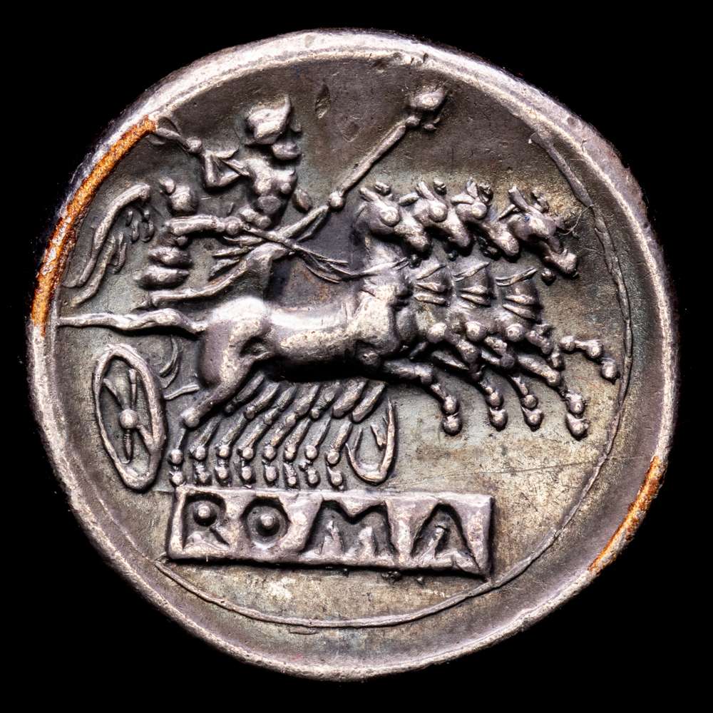 Numismática Barcala > Productos > Anónimo. Didracma – Cuadrigato. 225-214 aC Incierta. (Craw-28/3). Ag. 6,76 gramos. Precioso ejemplar con una bella pátina irisada de monetario antiguo. En excelente estado de conservación.