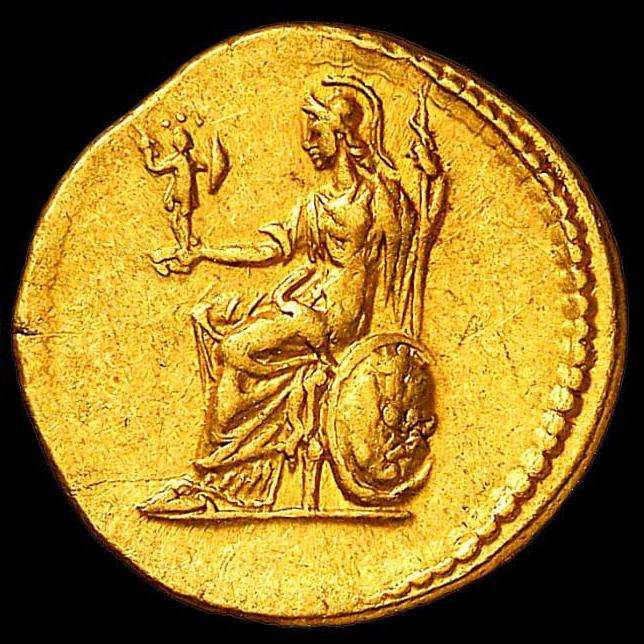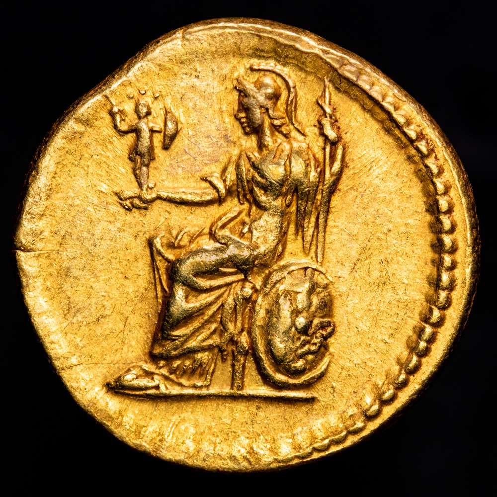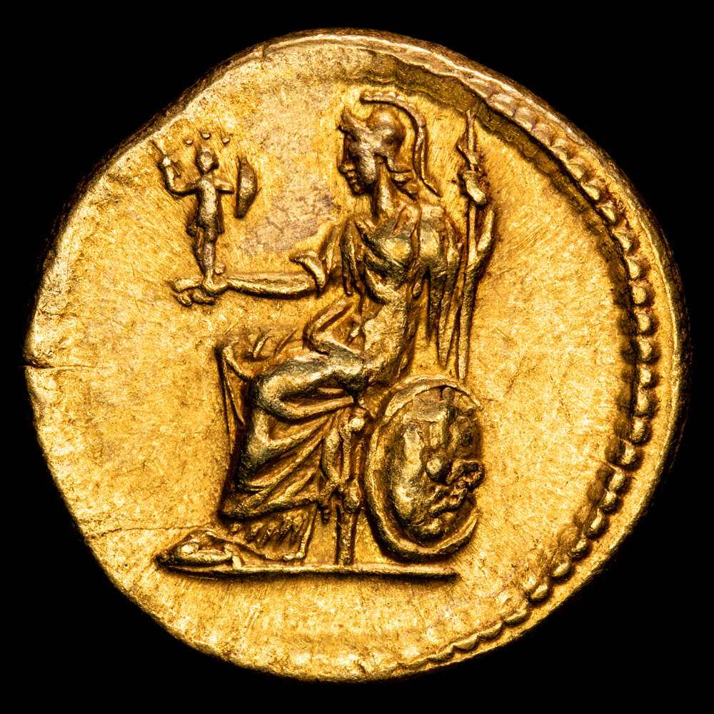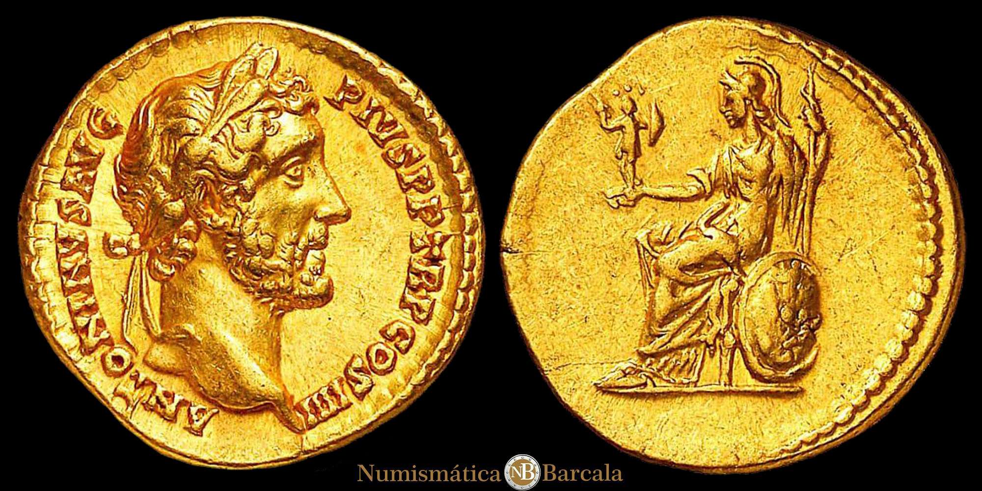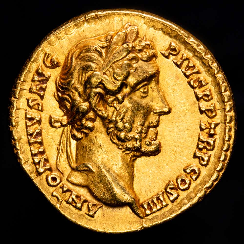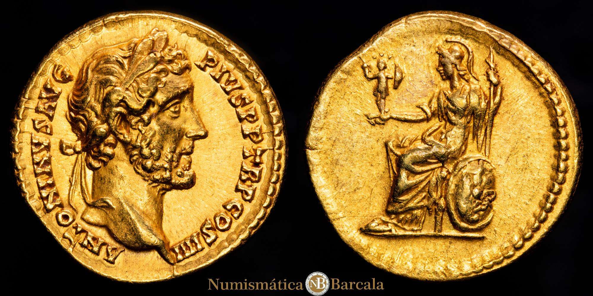 Antonino Pío. Áureo. (146 d. C.). (Spink 4035) (Co. 1150) (RIC. 159) (Calico 1455). Anv.: ANTONINVS AVG. PIVS PP TR. P. COS. IIII. Su cabeza laureada. Rev.: Roma sentado a la izquierda, sosteniendo un paladio y una lanza, con escudo adornado junto al asiento. Ex Aureo & Calico 29/10/2008, n.º 1039. Ex Aureo & Calico 17/03/2022, n.º 2083. 7,54 g. Muy bella. EBC/EBC-.