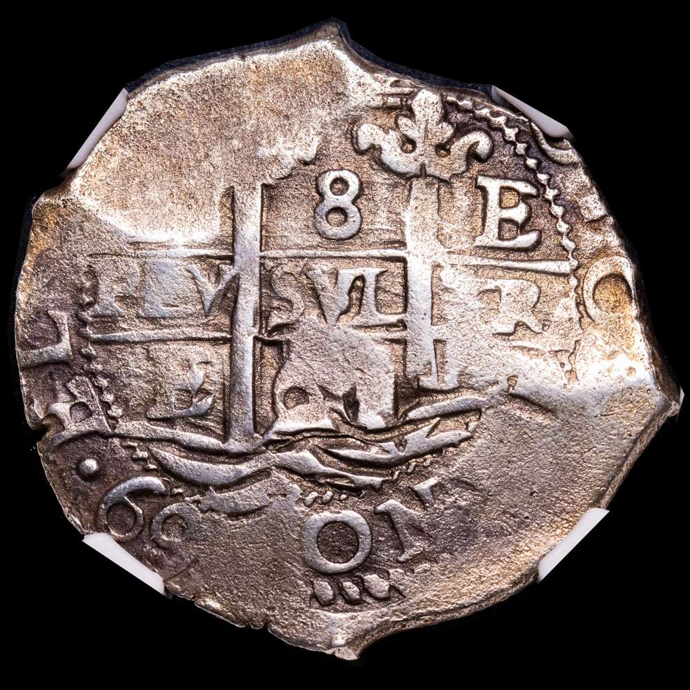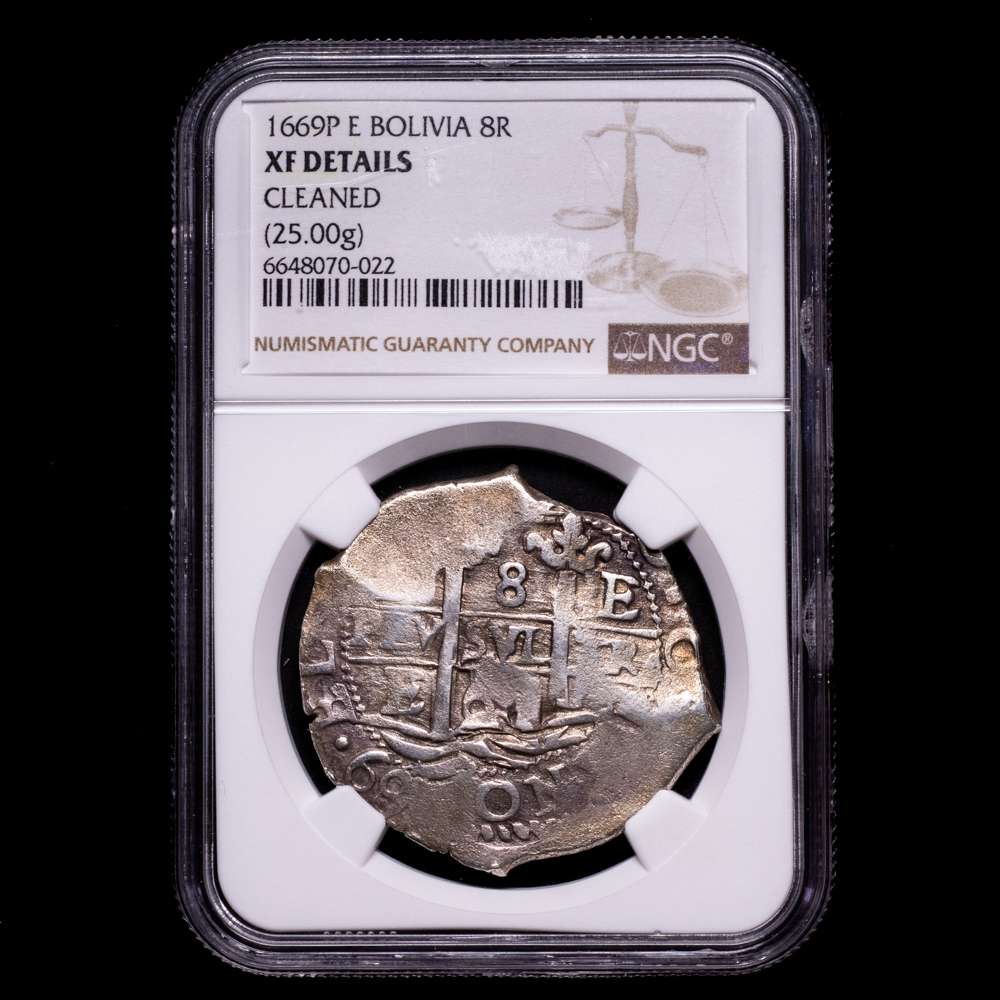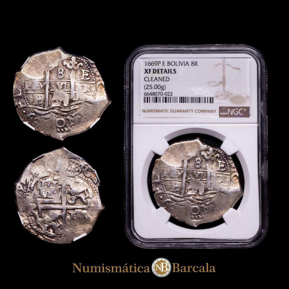 Numismática Barcala > Productos > ARLOS II (1665-1700). 8 reales. (Ar. 25,00g/37mm). 1669. Potosí E. (Cal-2019-700). Triple fecha la del anverso parcialmente. Encapsulada por NGC XF Detalles.