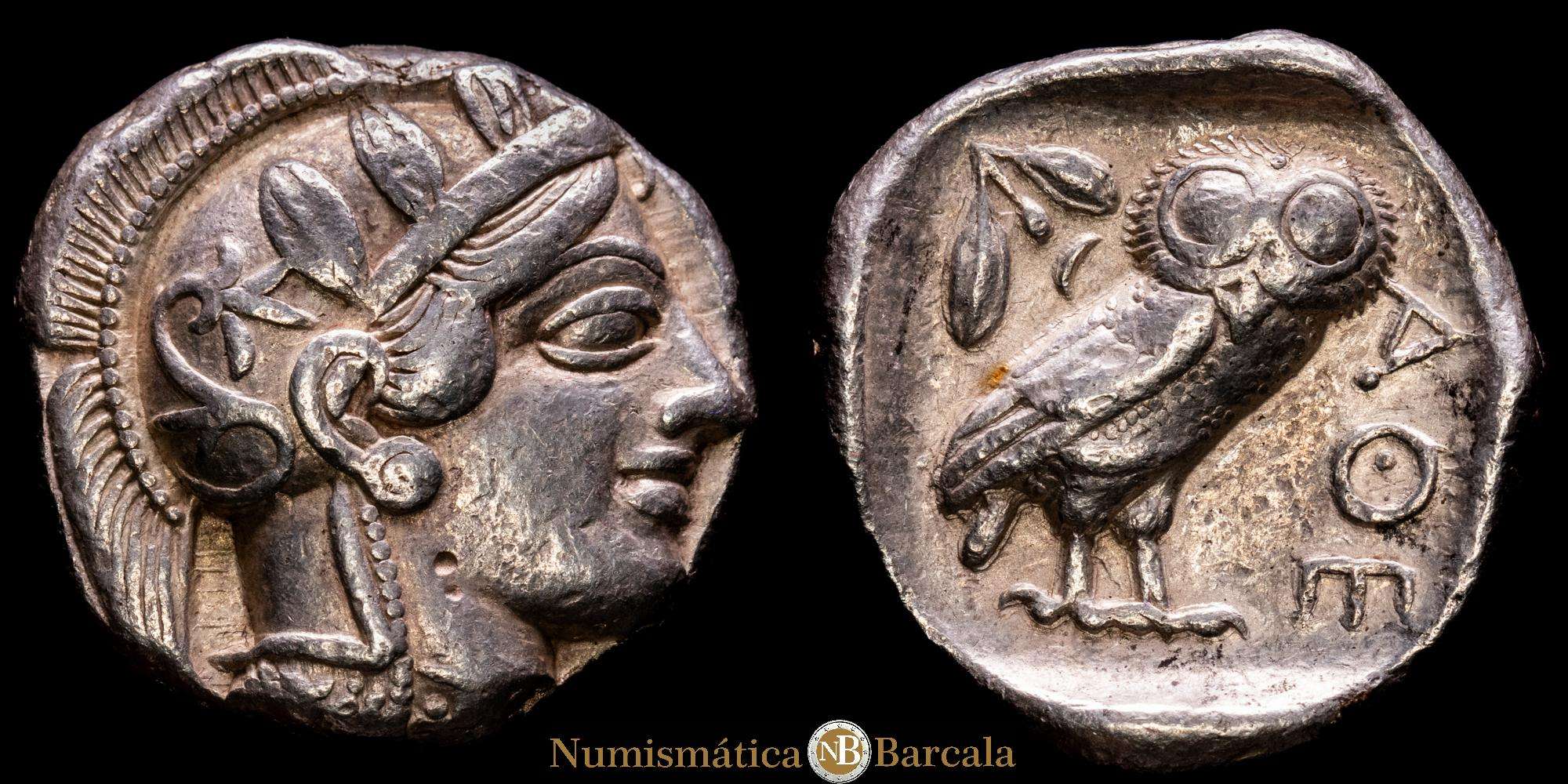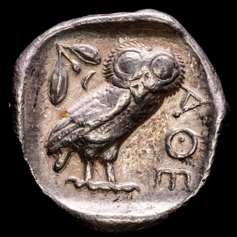 ÁTICA. Atenas (circa 454-404 a. C.). Tetradracma. Anv.: Cabeza de Atenea con yelmo a derecha. Rev.: AΘE. Búho de pie a la derecha, con la cabeza mirando; rama de olivo y media luna a la izquierda; todo dentro de un cuadrado incuso. Kroll 8; HGC 4, 1597. Estado: Cimera completa visible. Tonos bonitos. Muy buena conservación. Peso: 17,2 g. Diámetro: 23 mm.
